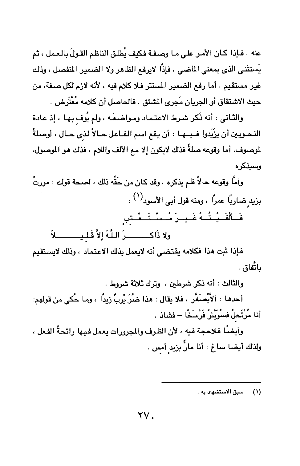 والثاني: أنه ذكَر شرط الاعتماد ومواضعَه، ولم يُوفِ بها، إذ عادة النحويين أن يزَيَدوا فيها: أن يقع اسم الفاعل حالاً لذِي حال، أوصلةً لموصوف. أما وقوعه صلةً فلذلك لا يكون إلا مع الألف واللام، فذلك هو الموصول، وسيذكره