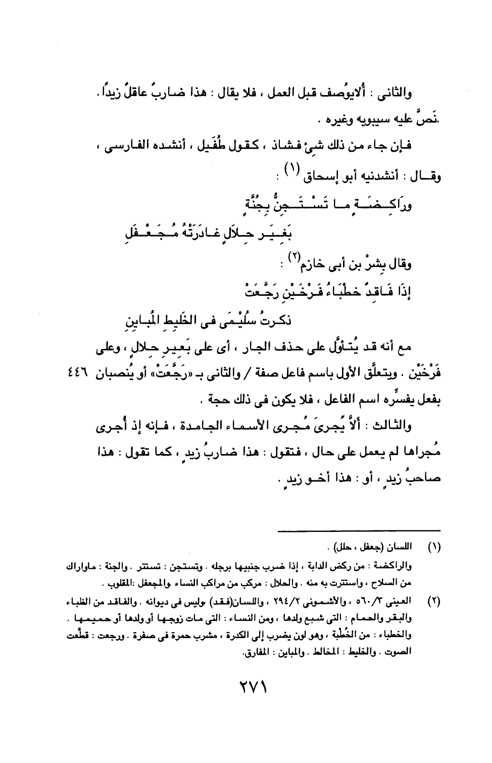 مع أنه قد يُتأول على حذف الجار، أي على بَعِيرِ حِلالٍ، وعلى فَرْخَيْن. ويتعلَّق الأول باسم فاعل صفة/ والثاني بـ ((رَجَّعَتْ)) أو يُنصبان بفعل يفسِّره اسم الفاعل، فلا يكون في ... 446 ذلك حجة.