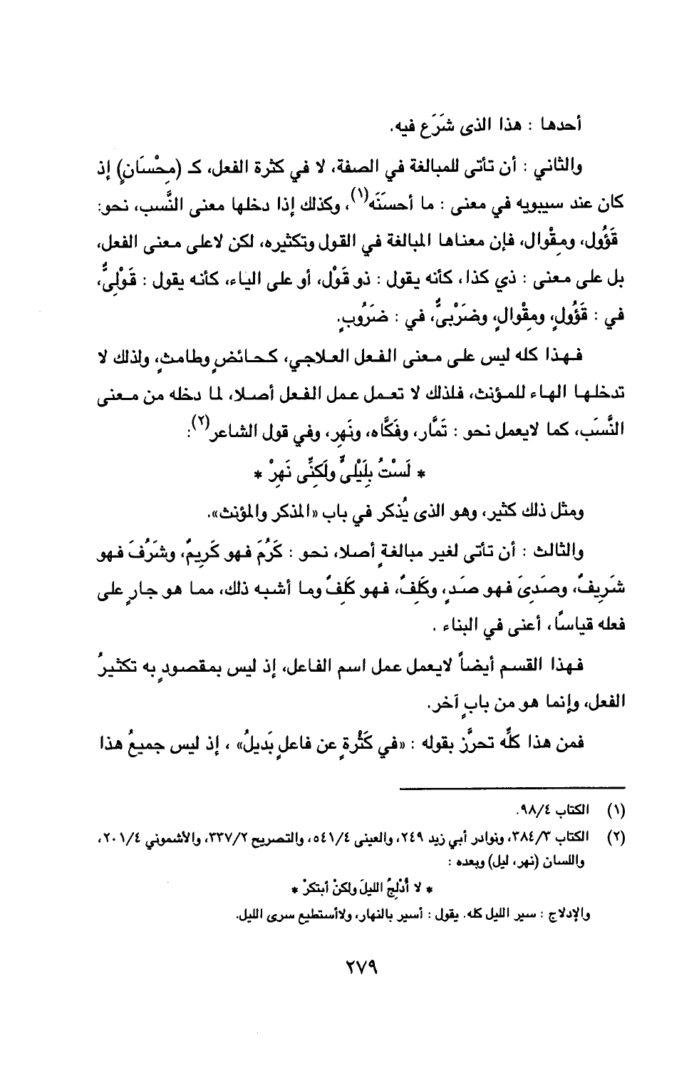 والثاني: أن تأتي للمبالغة في الصفة، لا في كثرة الفعل، كـ (مِحْسَانٍ) إذ كان عند سيبويه في معنى: ما أحسَتَه (1)، وكذلك إذا دخلها معنى النَّسب، نحو: قَؤُول، ومِقْوال، فإن معناها المبالغة في القول وتكثيره، لكن لا على معنى الفعل، بل على معنى: ذي كذا، كأنه يقول: ذو قَوْل، أو على الياء، كأنه يقول: قَوْلِيٌّ، في: قَؤُولٍ، ومِقْوالٍ، وضَرْبيُّ، في: ضَرُوبٍ.