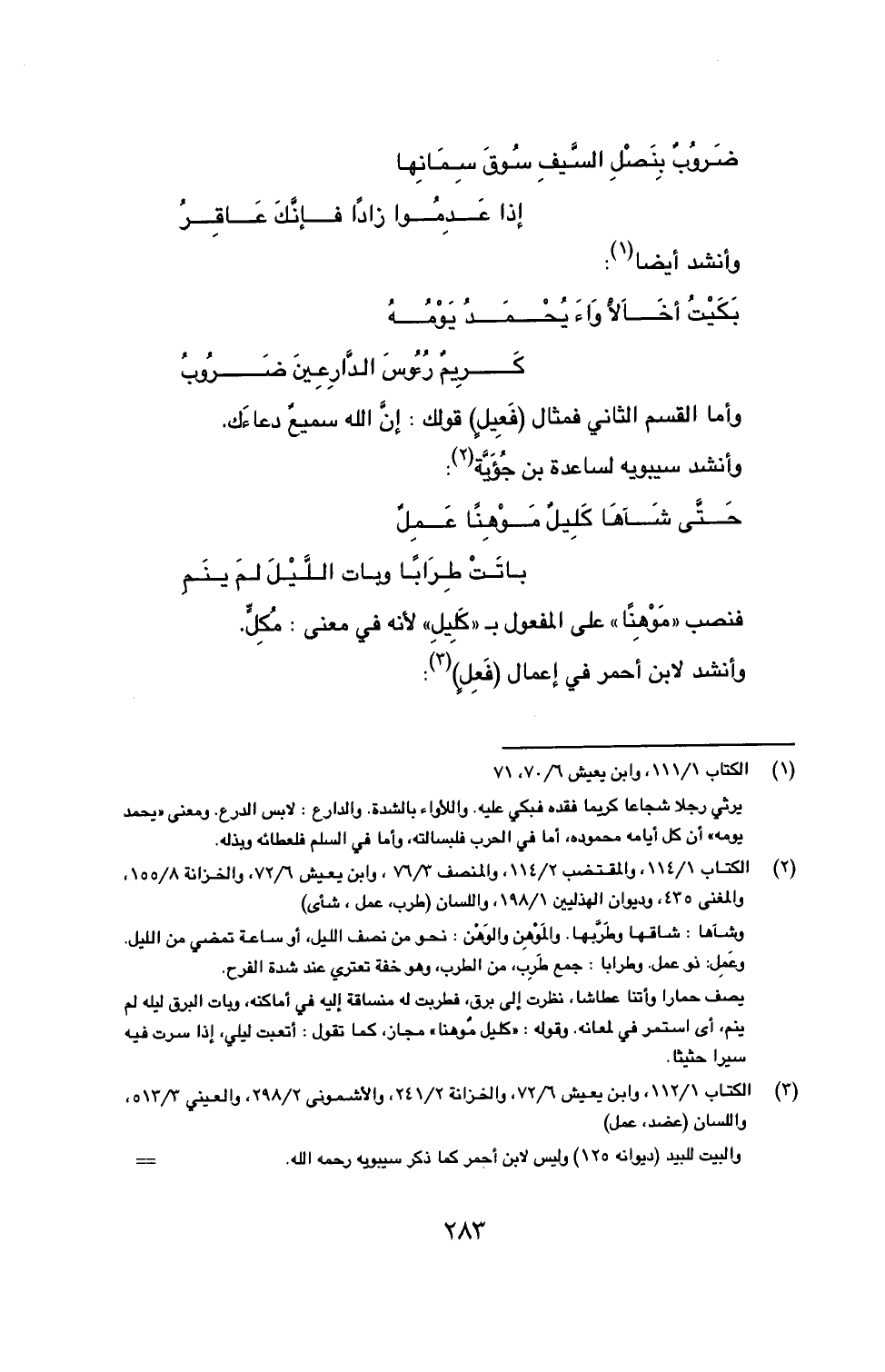 (2) الكتاب 1/ 114، والمقتضب 2/ 114، والمنصف 3/ 76، وابن يعيش 6/ 72، والخزانة 8/ 155، والمغني 435، وديوان الهذليين 1/ 198، واللسان (طرب، عمل، شأى). وشَاها: شاقها وطَرَّبها. والمَوْهِن والوَهْن: نحو من نصف الليل، أو ساعة تمضي من الليل. وعَمِل: ذو عمل. وطرابا: جمع طَرِب، من الطرب، وهو خفة تعتري عند شدة الفرح. يصف حمارا وأتنا عطاشا، نظرت إلى برقٍ، فطربت له منساقة إليه في أماكنه، وبات البرق ليله لم ينم، أي استمر في لمعانه. وقوله: ((كليل موهنا)) مجاز، كما تقول: أتعبت ليلي، إذا سرت فيه سيرا حثيثا.