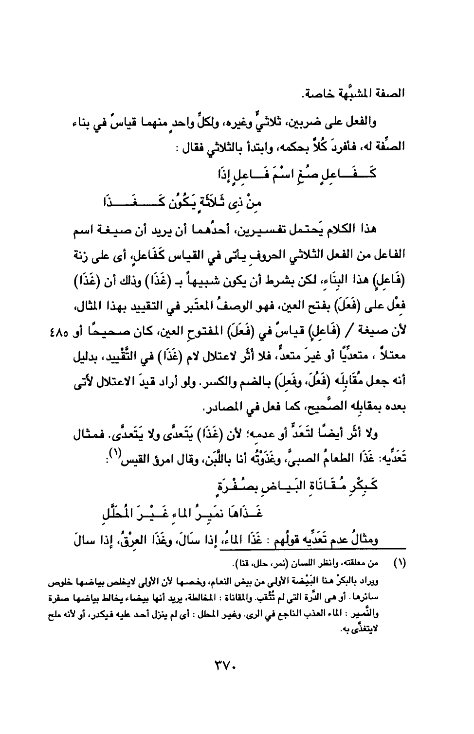 هذا الكلام يَحتمل تفسيرين، أحدهما أن يريد أن صيغة اسم الفاعل من الفعل الثلاثي الحروفِ يأتي في القياس كَفَاعلٍ، أي على زنة (فَاعِلٍ) هذا البِنَاءِ، لكن بشرط أن يكون شبيهاً بـ (غَذَا) وذلك أن (غَذَا) فِعْل على (فَعَلَ) بفتح العين، فهو الوصفُ المعتَبر في التقييد بهذا المثال، لأن صيغة/ (فَاعِلٍ) قياسٌ في (فَعَلَ) المفتوحِ العين، كان صحيحاً أو معتلاً، متعدِّياً أو غيرَ 485 متعدٍّ، فلا أَثَر لاعتلال لام (غَذَا) في التَّقْييد، بدليل أنه جعل مُقَابِلَه (فَعُلَ، وفَعِلَ) بالضم والكسر. ولو أراد قيدَ الاعتلال لأتى بعده بمقابِله الصحيح، كما فعل في المصادر.
