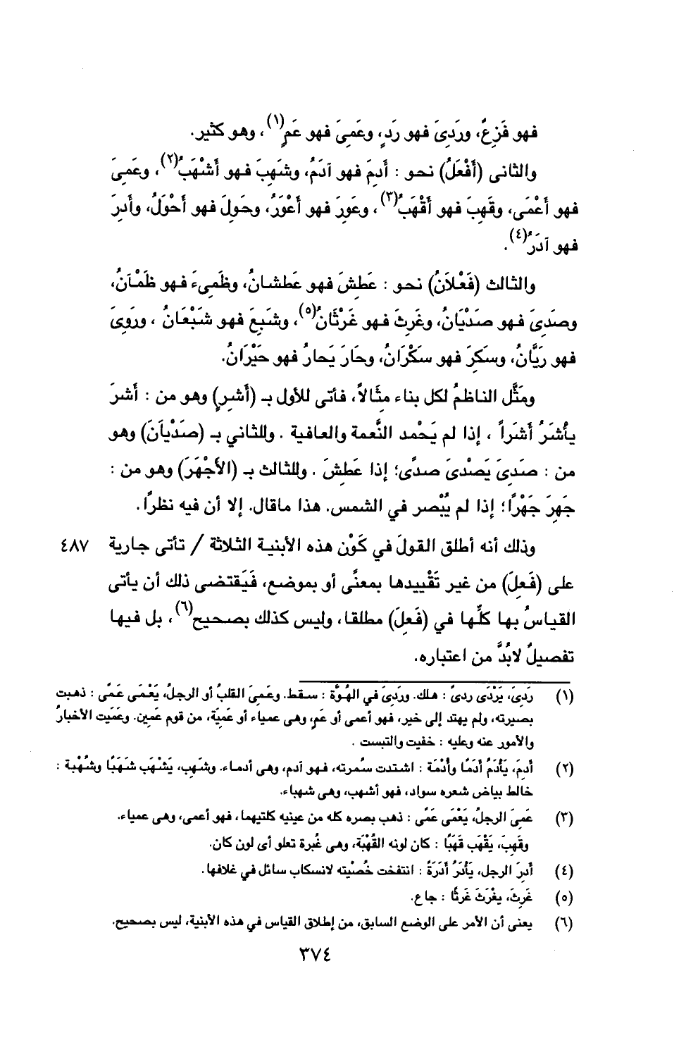 والثاني (أَفْعَلُ) نحو: أَدِمَ فهو آدَمُ، وشَهِبَ فهو أَشْهَبُ (2)، وعَمِىَ فهو أَعْمَى، وقَهِيَ فهو أَقْهِبُ (3)، وعَوِرَ فهو أَعْوَرُ، وحَوِلَ فهو أَحْوَلُ، وأَدِرَ فهو آدَرُ (4).