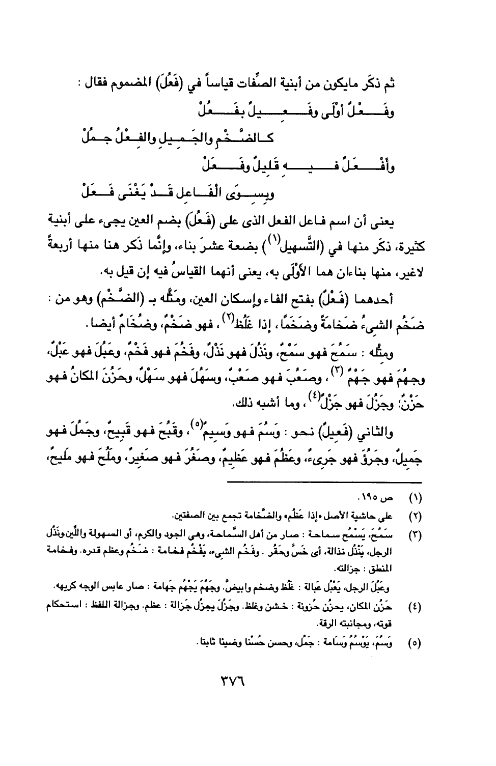 والثاني (فَعِيلٌ) نحو: وَسُمَ فهو وَسِيمٌ (5)، وقَبُحَ فهو قَبِيحٌ، وجَمُلَ فهو جَمِيلٌ، وجَرُؤَ فهو جَرِئٌ، وعَظُمَ فهو عَظِيمٌ، وصَغُرَ فهو صَغِيرٌ، ومَلُحَ فهو مَليحٌ،