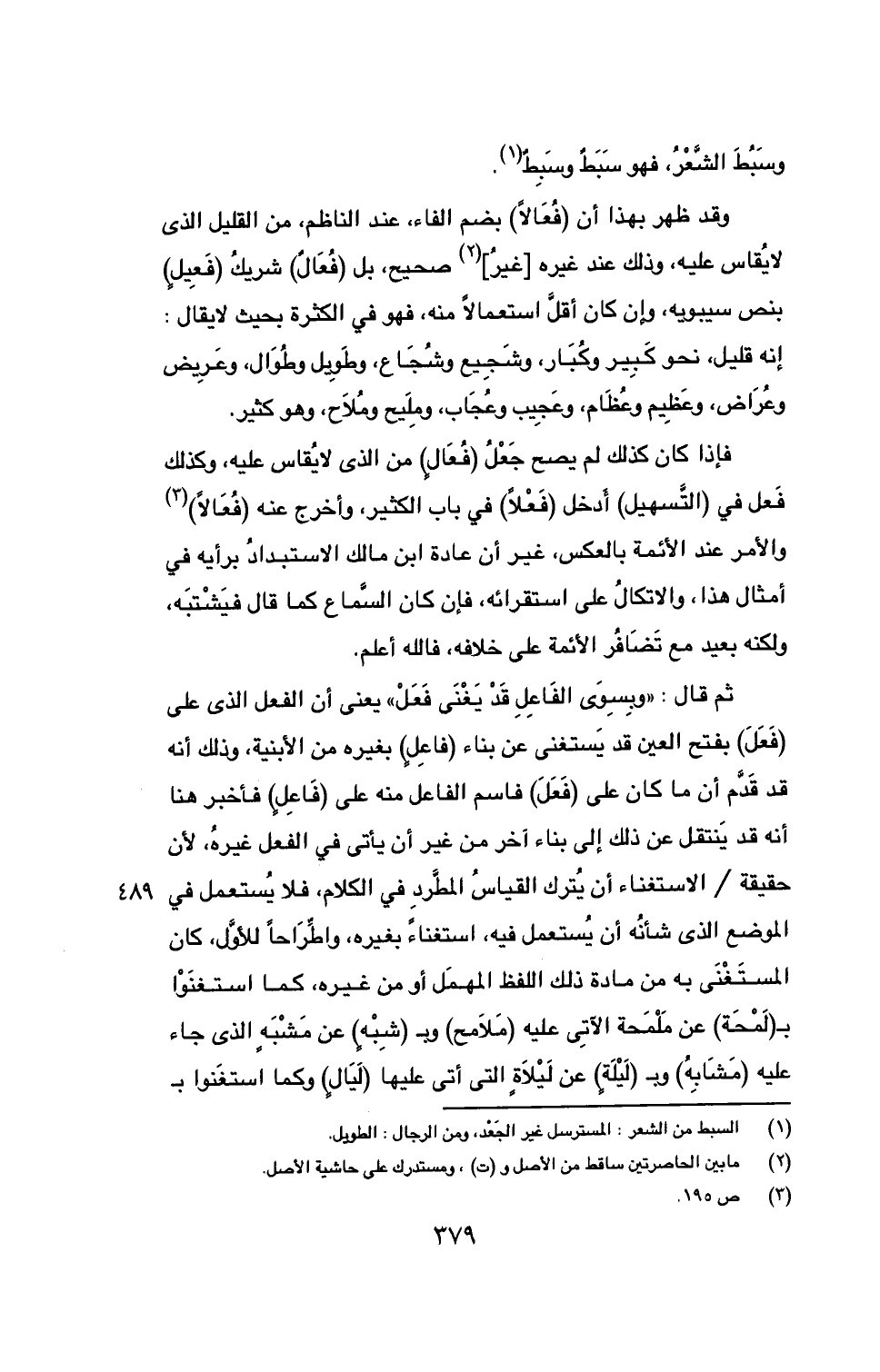 وقد ظهر بهذا أن (فُعَالاً) بضم الفاء، عند الناظم، من القليل الذي لا يُقاس عليه، وذلك عند غيره [غيرُ] (2) صحيح، بل (فُعَالٌ) شريكُ (فَعِيلٍ) بنص سيبويه، وإن كان أقلَّ استعمالاً منه، فهو في الكثرة بحيث لا يقال: غنه قليل، نحو كَبير وكُبَار، وشَجِيع وشُجَاع، وطَوِيل وطُوَال، وعَرِيض وعُرَاض، وعَظِيم وعُظَام، وعَجِيب وعُجَاب، ومَلِيح ومُلاَح، وهو كثير.