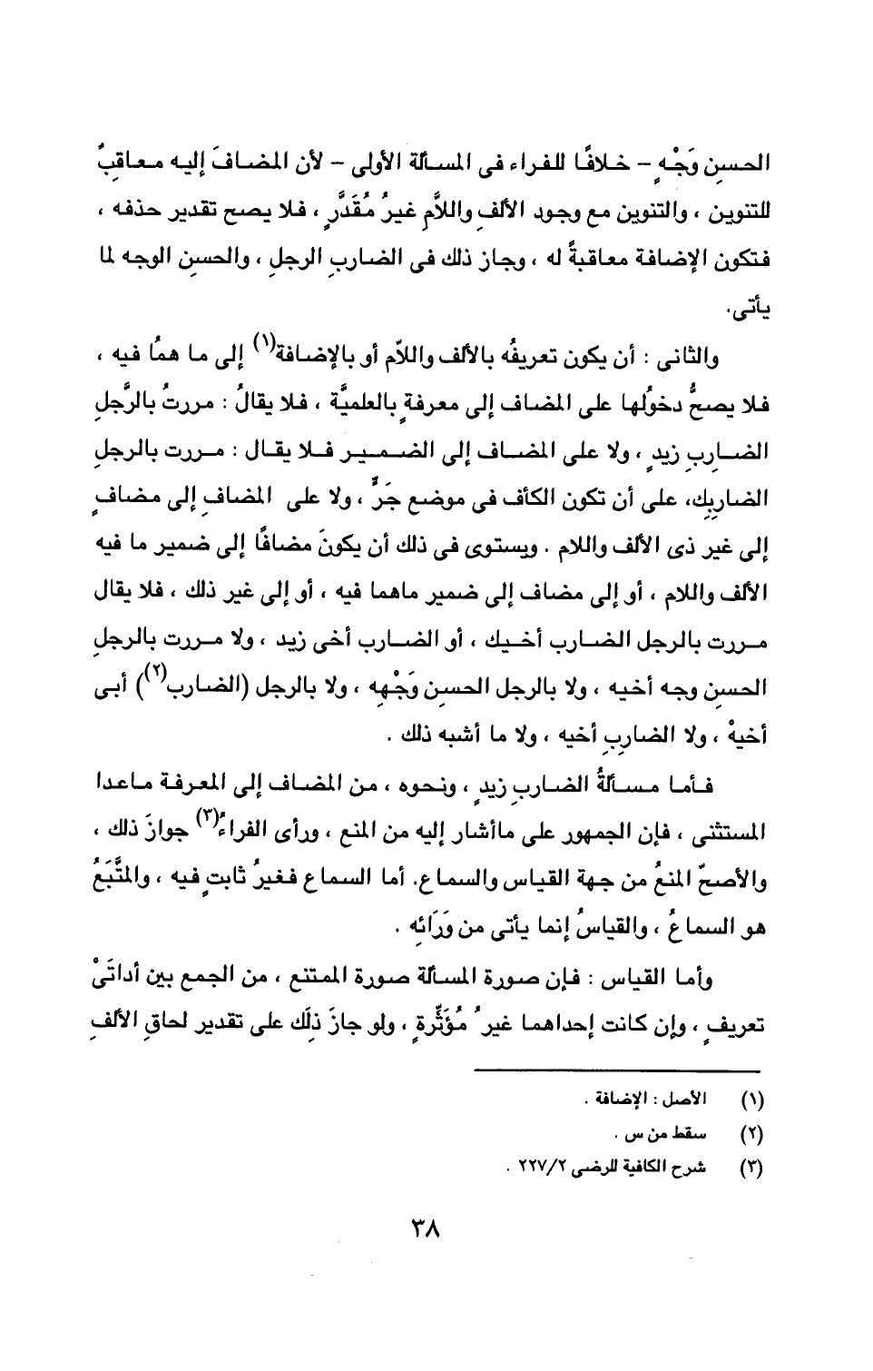 الحسِن وَجْهٍ (خلافا للفراء في المسألة الأولى (لأن المضافَ إليه معاقِبٌ للتنوين، والتنوين مع وجود الألفِ واللامِ غيرُ مُقَدَّرٍ، فلا يصح تقدير حذفه، فتكون الإضافة معاقبةً له، وجاز ذلك في الضاربِ الرجلِ، والحسن الوجه لما يأتي.