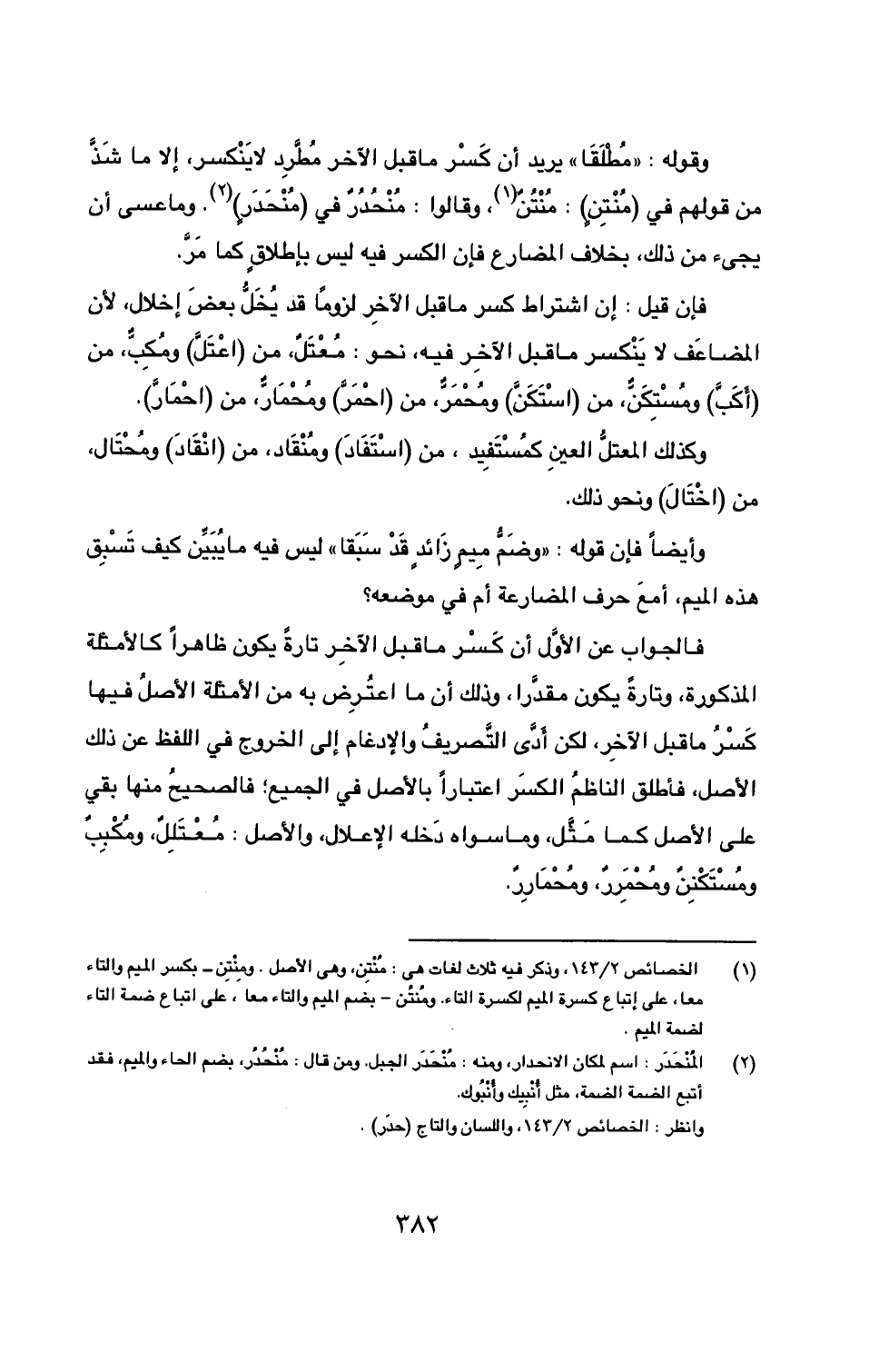 وقوله: ((مُطْلَقَا)) يريد أن كَسْر ما قبل الآخر مُطَّرِد لا يَنْكسر، إلا ما شَذَّ من قولهم في (مُنْتِنٍ): مُنْتُنٌ (1)، وقالوا: مُنْحُدُرٌ في (مُنْحَدَرٍ) (2). وما عسى أن يجئ من ذلك، بخلاف المضارع فإن الكسر فيه ليس بإطلاقٍ كما مَرَّ.