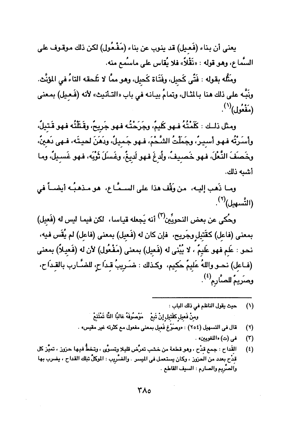 وحُكي عن بعض النحويِّين (3) أنه يَجعله قياسا، لكن فيما ليس له (فَعِيل) بمعنى (فاعِل) كقَتِيلٍ وجَريح، فإن كان له (فَعِيل) بمعنى (فاعِل) لم يُقَس فيه، نحو: عَلِم فهو عَلِيمٌ، لا يُبْنى له (فَعِيل) بمعنى (مَفْعُول) لأن له (فَعِيلاً) بمعنى (فاعِل) نحو واللهُ عَلِيمٌ حَكِيم، وكذلك: ضَرِيبُ قِدَاحٍ، للضَّارب بالقِدَاح، وصَريمٌ للصَّارِم (4).