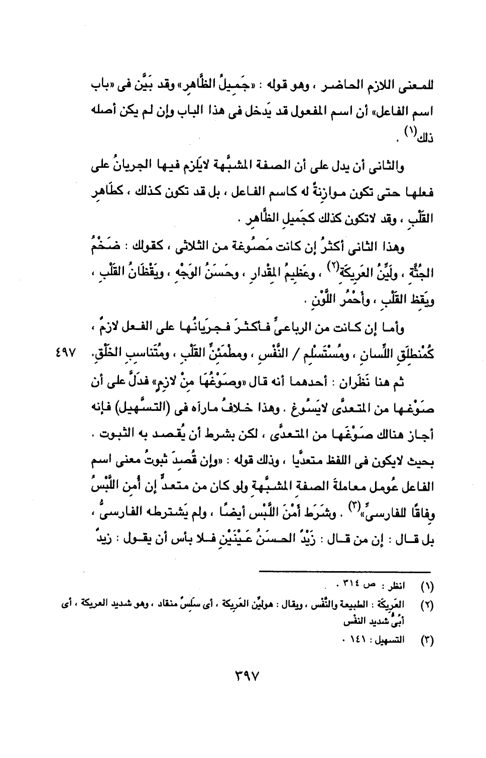 ثم هنا نَظَران: أحدهما انه قال ((وصَوْغُهَا مِنْ لازِمٍ)) فدَلَّ على أن صَوْغها من المتعدَي لا يَسُوغ. وهذا خلافُ ما رآه في (التسهيل) فإنه أجاز هنالك صَوْغها من المتعدَّي، لكن بشرط ان يُقصد به الثبوت. بحيث لا يكون في اللفظ متعدَّيا، وذلك قوله: ((وإن قُصِدَ ثبوتُ معنى اسم الفاعل عُومل معاملةَ الصفةِ المشبَّهةِ ولو كان من متعدٍّ إن أُمِن اللَّبْسُ وِفاقاً للفارسيِّ)) (3). وشَرَط أَمْنَ اللَّبْس أيضاً، ولم يَشترطه الفارسيُ، بل قال: إن من قال: زَيْدٌ الحسَنُ عَيْنَينِ فلا بأس أن يقول: زيدٌ