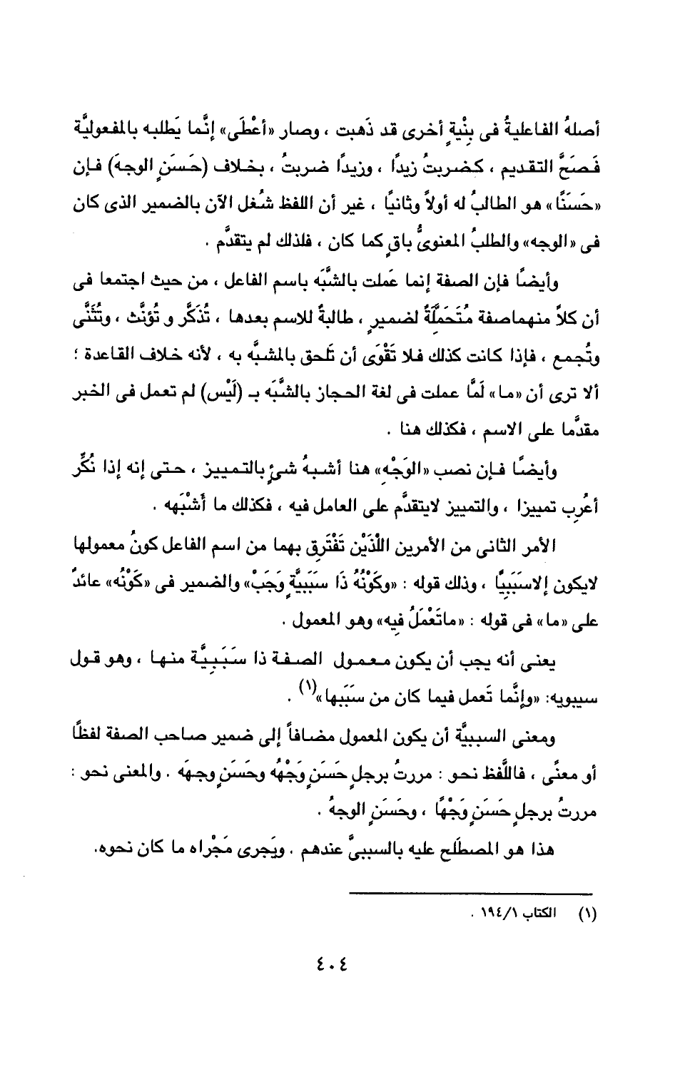 ومعنى السببيَّة أن يكون المعمول مضافاً إلى ضمير صاحب الصفة لفظاً أو معنىً، فاللَّفظ نحو: مررتُ برجلٍ حَسَنٍ وَجْهُه وحَسَنٍ وجهَه. والمعنى نحو: مررتُ برجلٍ حَسَنٍ وَجْهاً، وحَسَنٍ الوجهُ.