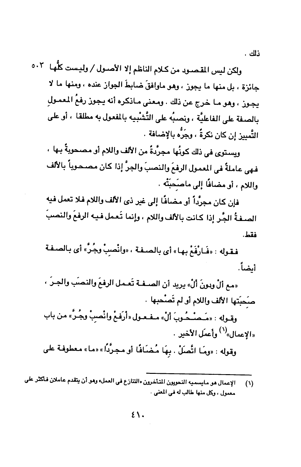 ولكن ليس المقصود من كلام الناظم إلا الأصول/ وليست كلُّها جائزة، بل منها ما 503 يجوز، وهو ما وافقَ ضابطَ الجواز عنده، ومنها ما لا يجوز، وهو ما خرج عن ذلك. ومعنى ما ذكره أنه يجوز رفعُ المعمولِ بالصفة على الفاعليَّة، ونصبُه على التَّشْبيه بالمفعول به مطلقا، أو على التَّمييز إن كان نكرة، وجَرُّه بالإضافة.