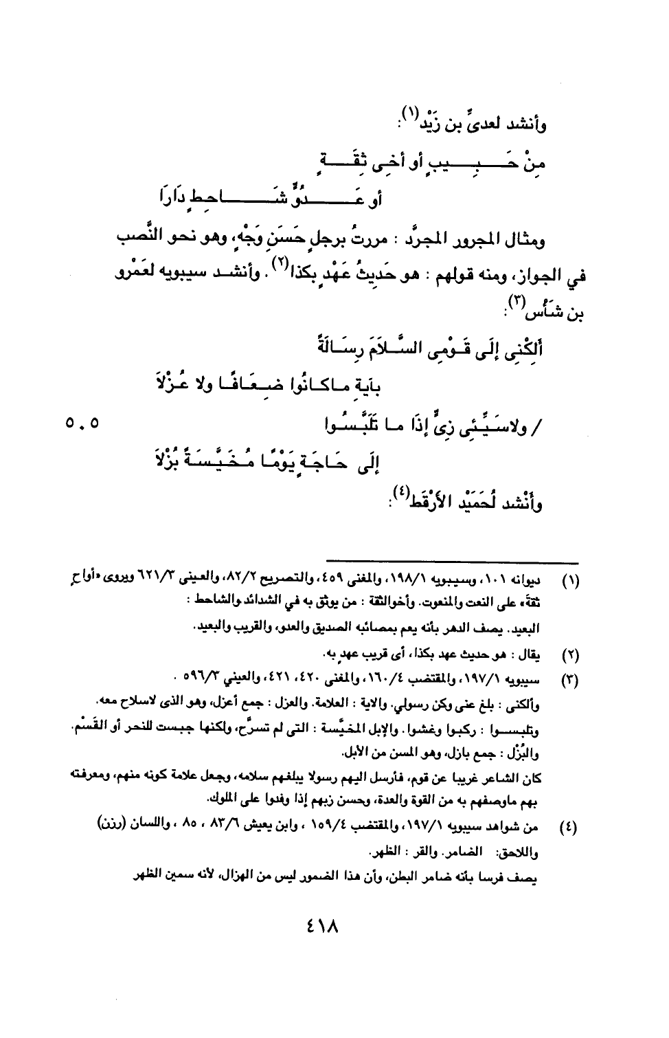 (3) سيبويه 1/ 197، والمقتضب 4/ 160، والمغني 420، 421، والعيني 3/ 596. وألكنى: بلغ عني وكن رسولي. والاية: العلامة. والعزل: جمع أعزل، وهو الذي لا سلاح معه. وتلبسوا: ركبوا وغشوا. والإبل المخيَّسة: التي لم تسرَّح، ولكنها جبست للنحر أو القَسْم. والبُزْل: جمع بازل، وهو المسن من الأبل. كان الشاعر غريبا عن قوم، فأرسل إليهم رسولا يبلغهم سلامه، وجعل علامة كونه منهم، ومعرفته بهم ما وصفهم به من القوة والعدة، وحسن زيهم إذا وفدوا على الملوك.
