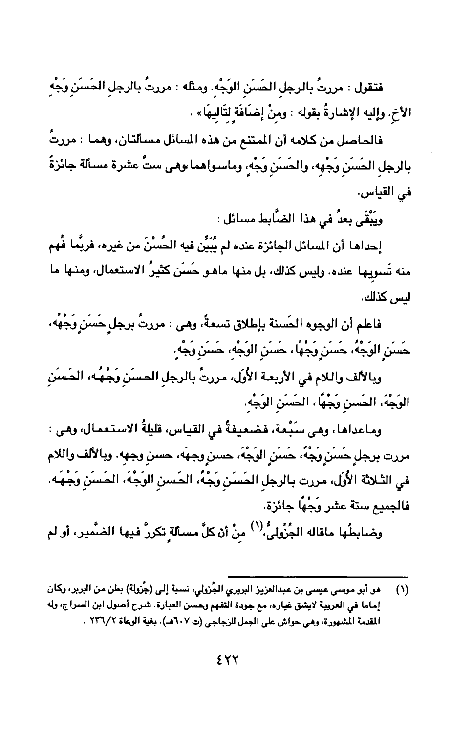 فاعلم أن الوجوه الحَسنة بإطلاق تسعةٌ، وهي: مررتُ برجلٍ حَسَنٍ وَجْهُه، حَسَنٍ الوَجْهُ، حَسَنٍ وَجْهاً، حَسَنِ الوَجْهِ، حَسَنِ وَجْهٍ.