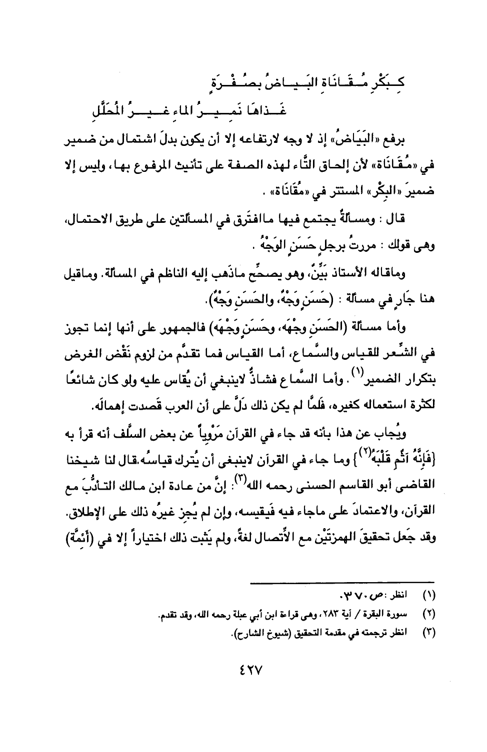 برفع ((البَيَاضُ)) إذ لا وجه لارتفاعه إلا أن يكون بدلَ اشتمال من ضمير في ((مُقَانَاة)) لأن إلحاق التَّاء لهذه الصفة على تأنيث المرفوع بها، وليس إلا ضميرَ ((البِكْر)) المستتر في ((مُقَانَاة)).