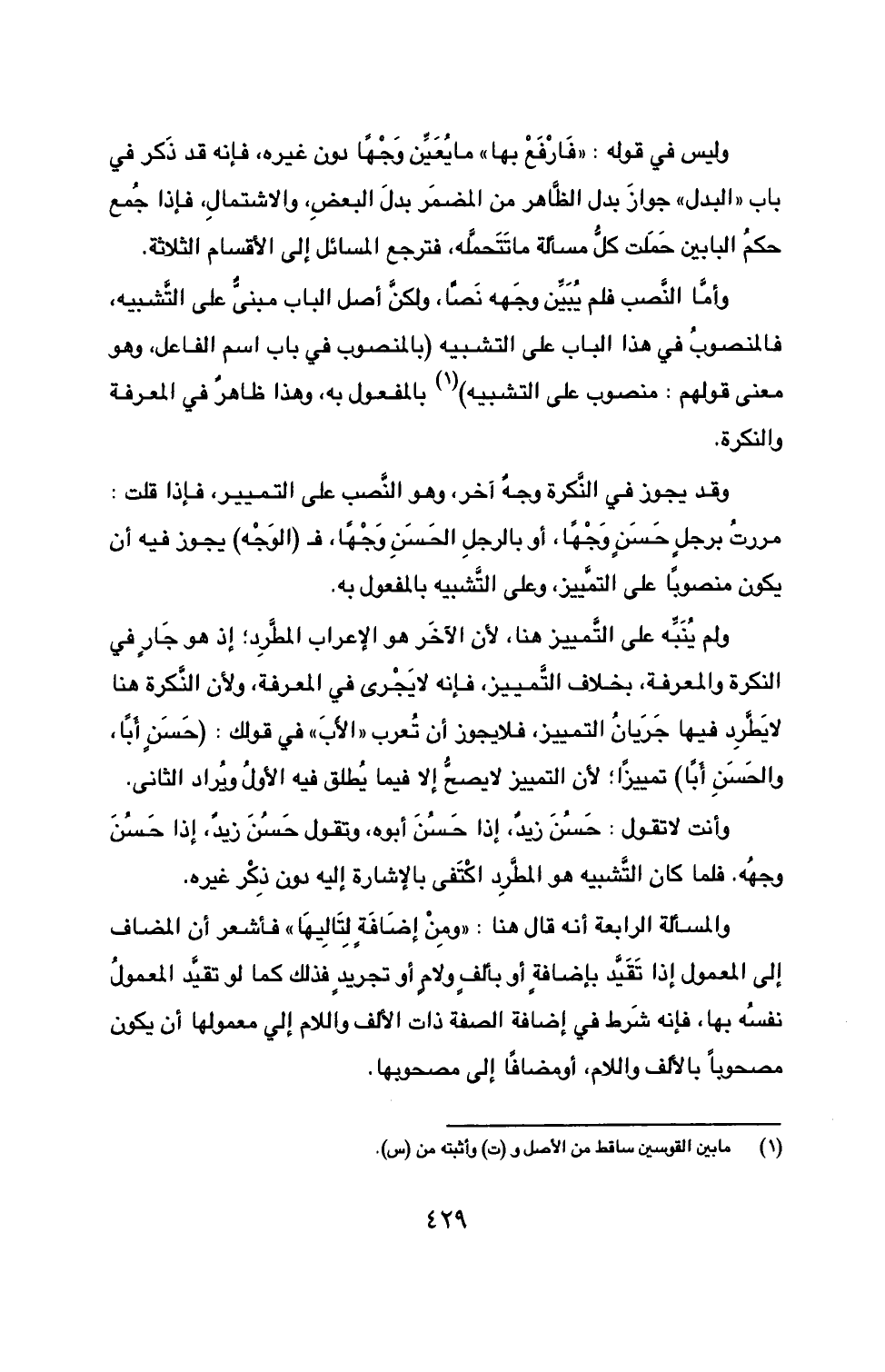 وأنت لا تقول: حَسُنَ زيدٌ، إذا حَسُنَ أبوع، وتقول حَسُنَ زيدٌ، إذا حَسُنَ وجهُه. فلما كان التَّشبيه هو المطَّرِد اكْتَفى بالإشارة إليه دون ذِكْر غيره.