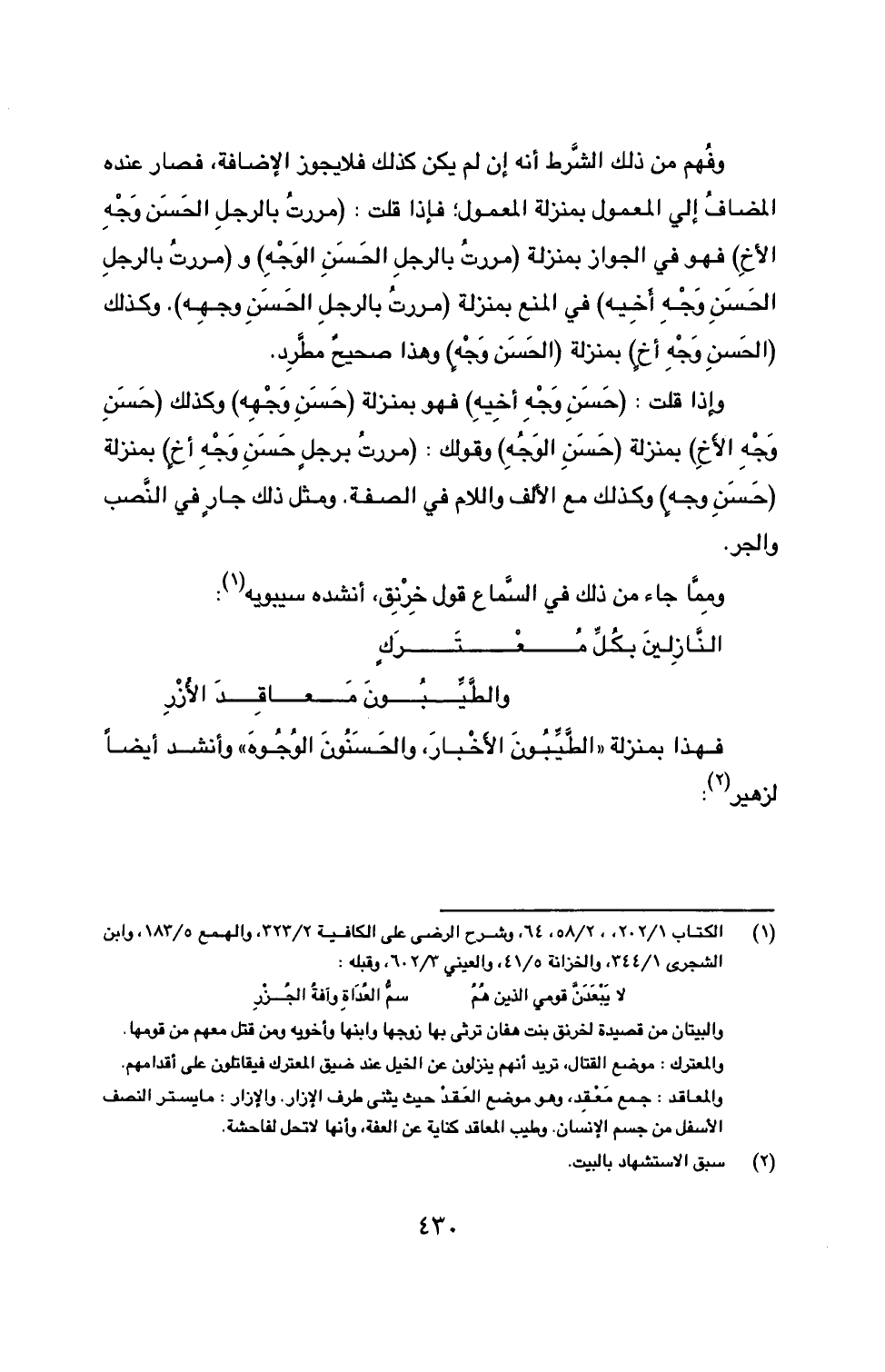 فهذا بمنزلة ((الطَّيِّبُونَ الأَخْبارَ، والحَسَنُونَ الوُجُوهَ)) وأنشد أيضاً لزهير (2):