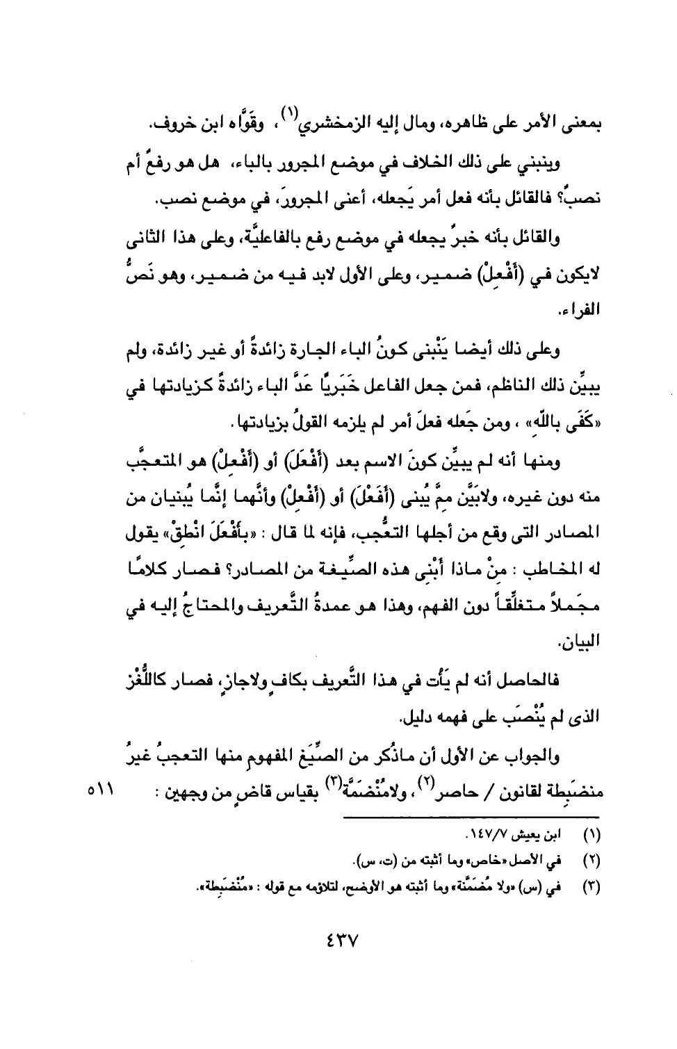 والجواب عن الأول أن ما ذُكر من الصِّيَغ المفهوم منها التعجبُ غيرُ منضَبِطة ... لقانون/ حاصر (2)، ولا مُنْضَمَّة (3) بقياس قاضٍ من وجهين: ... 511
