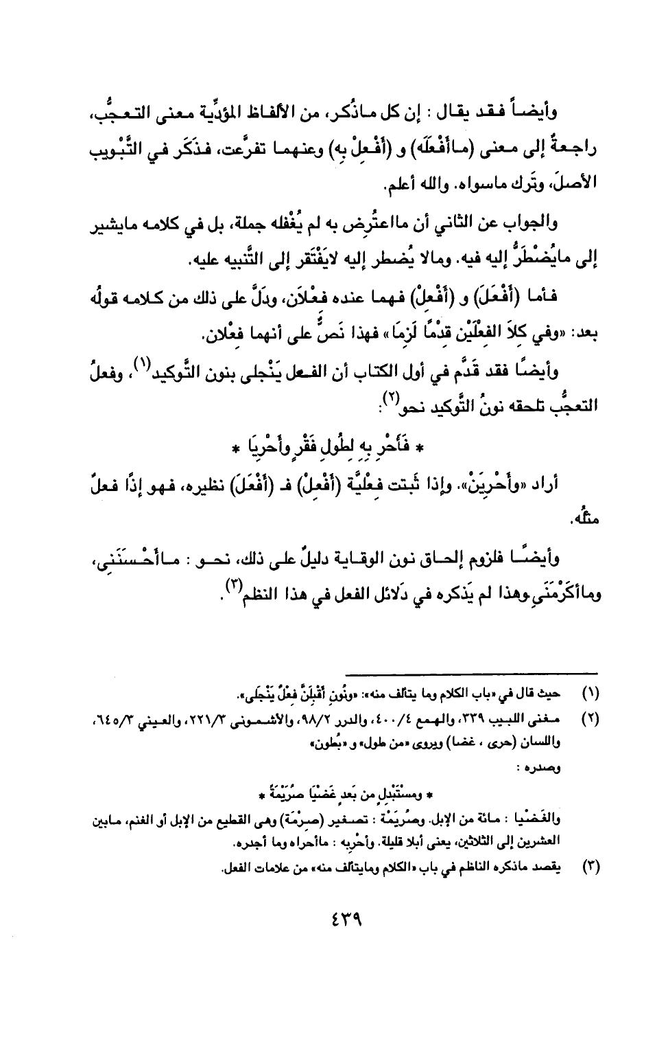 وايضاً فقد قَدَّم في أول الكتاب أن الفعل يَنْجلى بنون التَّوكيد (1)، وفعلُ التعجُّب تلحقه نونُ التَّوكيد نحو (2):