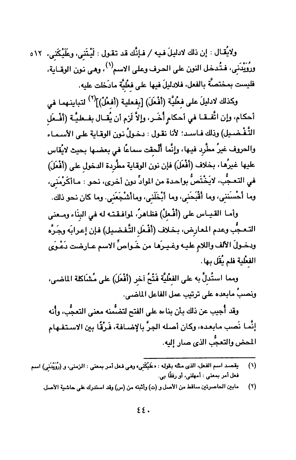 وكذلك لا دليلَ على فِعْليَّة (أَفْعَلَ) [بِفعلية (أَفِعْلْ)] (2) لتباينهما في أحكام، وإن اتَّفقا في أحكامٍ أُخَر، وإلاَّ لَزم أن يُقال بفعليَّة (أَفْعَلِ التَّفْضيل) وذلك فاسد؛ لأنا نقول: دخولُ نون الوقاية على الأسماء والحروف غيرُ مطَّرِد فيها، وإنَّما ألحِقت سماعاً في بعضها بحيث لا يُقاس عليها غيرُها، بخلاف (أَفْعَلَ) فإن نون الوقاية مطَّرِدة الدخولِ على (أَفْعَلَ) في التعجُّب، لا يَخْتَصُّ بواحدة من الموادِّ دون أخرى، نحو: ما أكَرْمَني، وما أَحْسَنَنِي، وما أَقْبَحَنِي، وما أَبْخَلَنِي، وما أَشْجَعَنِي. وما كان نحو ذلك.