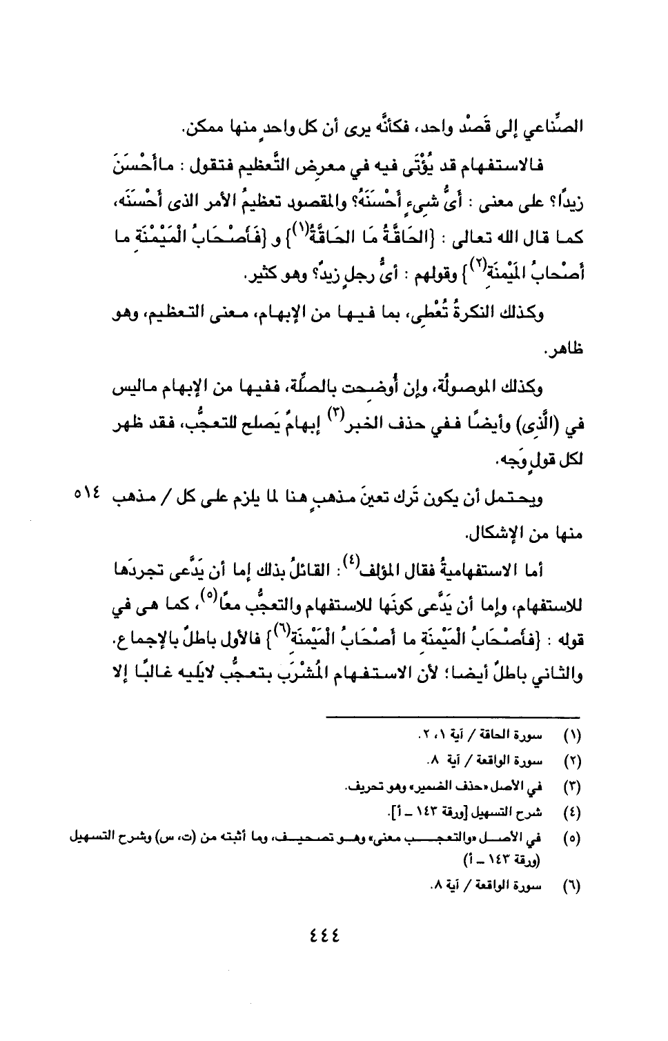 أما الاستفهاميةُ فقال المؤلف (4): القائلُ بذلك إما أن يَدَّعى تجردَها للاستفهام، وإما أن يَدَّعى كونَها للاستفهام والتعجُّب معاً (5)، كما هي في قوله: {فأَصْحَابُ الْمَيْمنَةِ ما أَصْحَابُ الْمَيْمنَةِ (6)} فالأول باطلٌ بالإجماع. والثاني باطلٌ أيضا؛ لأن الاستفهام المُشْرَب بتعجُّب لا يَليه غالباً إلا