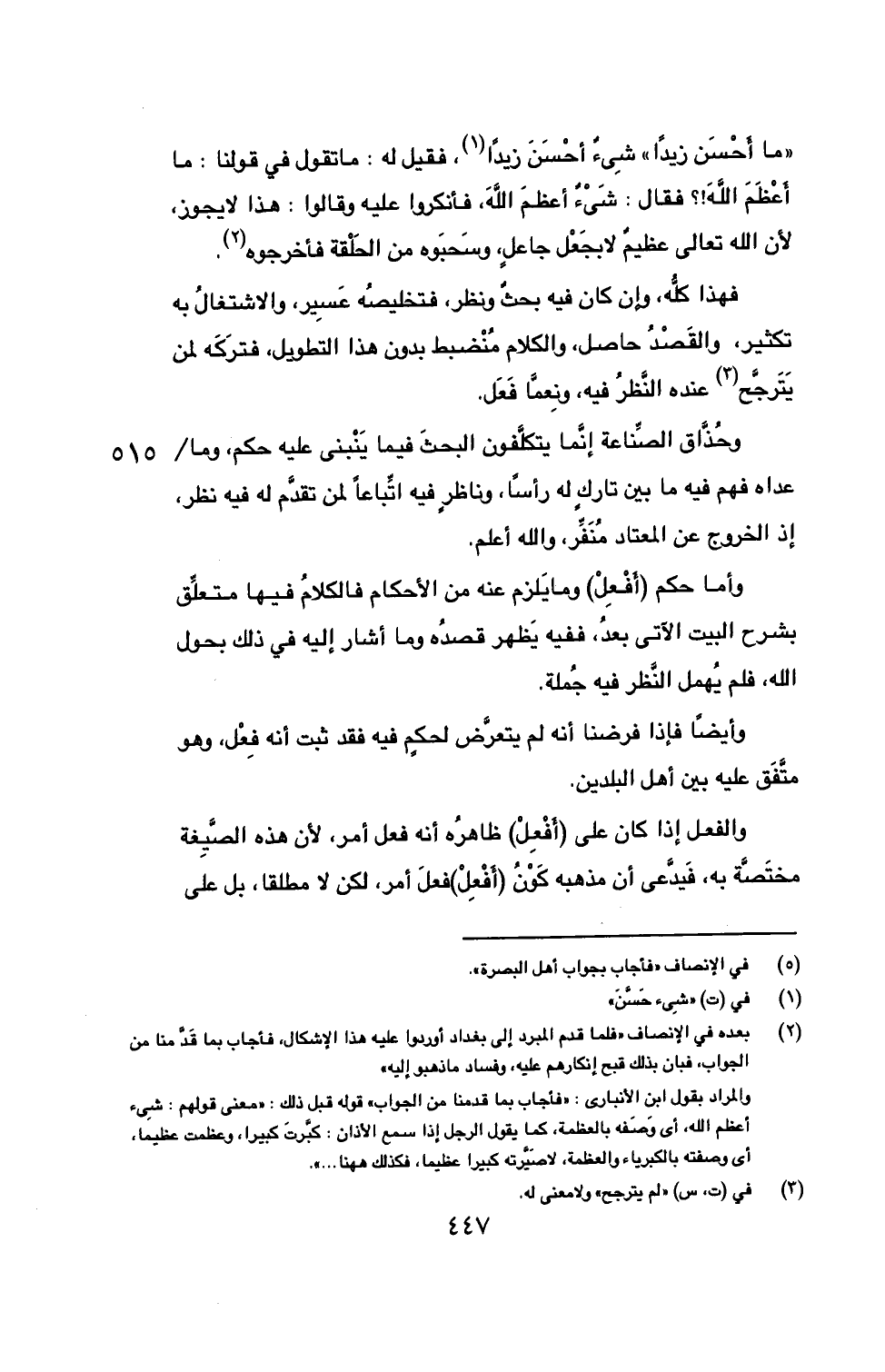 (2) بعده في الإنصاف ((فلما قدم المبرد إلى بغداد أوردوا عليه هذا الإشكال، فأجاب بما قَدَّمنا من الجواب، فبان بذلك قبح إنكارهم عليه، وفساد ما ذهبوا إليه)). والمراد بقول ابن الأنباري: ((فأجاب بما قدمنا من الجواب)) قوله قبل ذلك: ((معنى قولهم: شِيء أعظم الله، اي وَصَفه بالعظمة، كما يقول الرجل إذا سمع الأذان: كَّبرتَ كبيرا، وعظمت عظيما، اي وصفته بالكبرياء والعظمة، لا صَيَّرته كبيرا عظيما، فكذلك ههنا ... )).