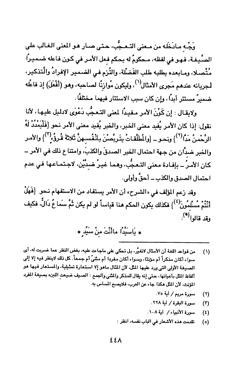 ولا يقال: إن كَوْنَ الأمر مفيداً لمعنى التعجَّب دَعْوَى لا دليل عليها، لأنا نقول: إذا كان الأمر يُفيد معنى الخبر، والخبر يُفيد معنى الأمر نحو {فَلْيَمْدُدْ لَهُ الرَّحْمنُ مَداً (2)} ونحو- {والمُطَلَّقاتُ يتَربَّصْنَ بأنْفُسِهنَّ ثَلاثَةَ قُروُءٍ (3)} والأمر والخبر ضِدَّان من جهة احتمال الخبر الصدقَ والكذبَ، وامتناع ذلك في الأمر- كان الأمرُ- بإفادة معنى التعجُّب، وهما غيرُ ضِدَّيْن، لاجتماعها في عدم احتمال الصدق والكذب- أحقَّ وأولى.