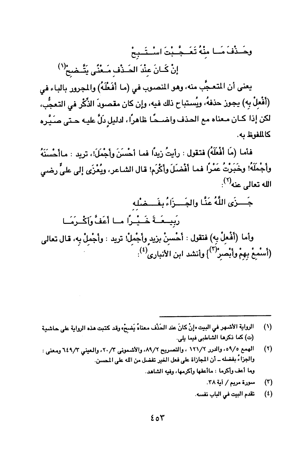 (2) الهمع 5/ 59، والدرر 2/ 121، والتصريح 2/ 89، والأشموني 3/ 20، والعيني 3/ 649 ومعنى: والجزاءُ بفضله- أن المجازاة على فعل الخير تفضل من الله على المحسن. وما أعف وأكرما: ما أعفها وأكرمها، وفيه الشاهد.