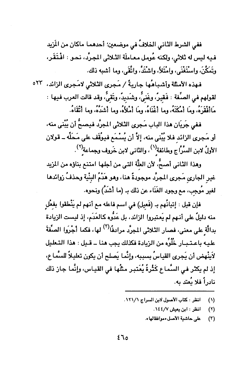 فإن قيل: إتيانُهم بـ (فَعِيل) في اسم فاعله مع أنهم لم يَنْطقوا بفِعْلٍ منه دليلٌ على أنهم لم يَعتبروا الزائد، بل عَدُّوه كالعَدَم، إذ ليست الزيادة بدالَّةٍ على معنى، فصار الثلاثي المجرَّد مرادفاً (3) لها، فكما أَجْرَوا الصِّفة عليه باعتبار خُلُوِّه من الزيادة فكذلك يجب هنا- قيل: هذا التعليل لاَ ينْهض أن يَجرى القياسُ بسببه، وإنَّما يَصلح أن يكون تعليلاً للسَّماع، إذ لم يكثر في السَّماع كَثْرةً يُعَتبر مثلُها في القياس، وإنَّما جاز ذلك نادراً فلا يُعتد به.
