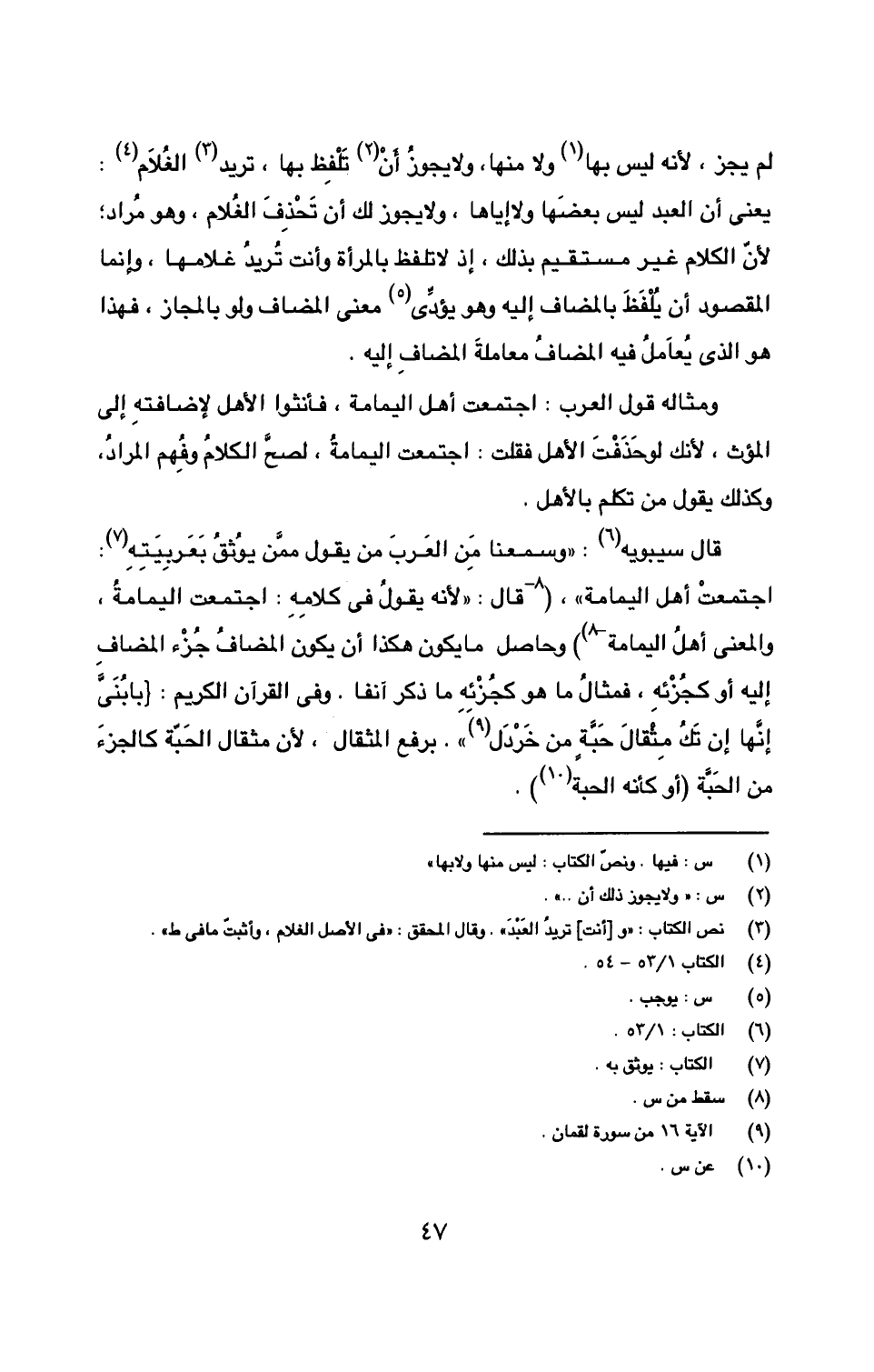 قال سيبويه (6): ((وسمعنا من العَربَ من يقول ممَّن يوُثقُ بَعَربِيَتِهِ (7): اجتمعتْ أهل اليمامة))، (8 (قال: ((لأنه يقولُ في كلامِهِ: اجتمعت اليمامةُ، والمعنى أهلُ اليمامة (8) وحاصل ما يكون هكذا أن المضافُ جُزْء المضافِ إليه أو كجُزْئهِ، فمثالُ ما هو كجُزئِهِ ما ذكر آنفا. وفي القرآن الكريم: {يا بُنَيَّ إنَّها إن تَكُ مِثقالَ حَبَّةٍ من خَرْدَل (9))). برفع المثقال، لأن مثقال الحَبّة كالجزء من الحَبَّة (أو كأنه الحبة (10)).