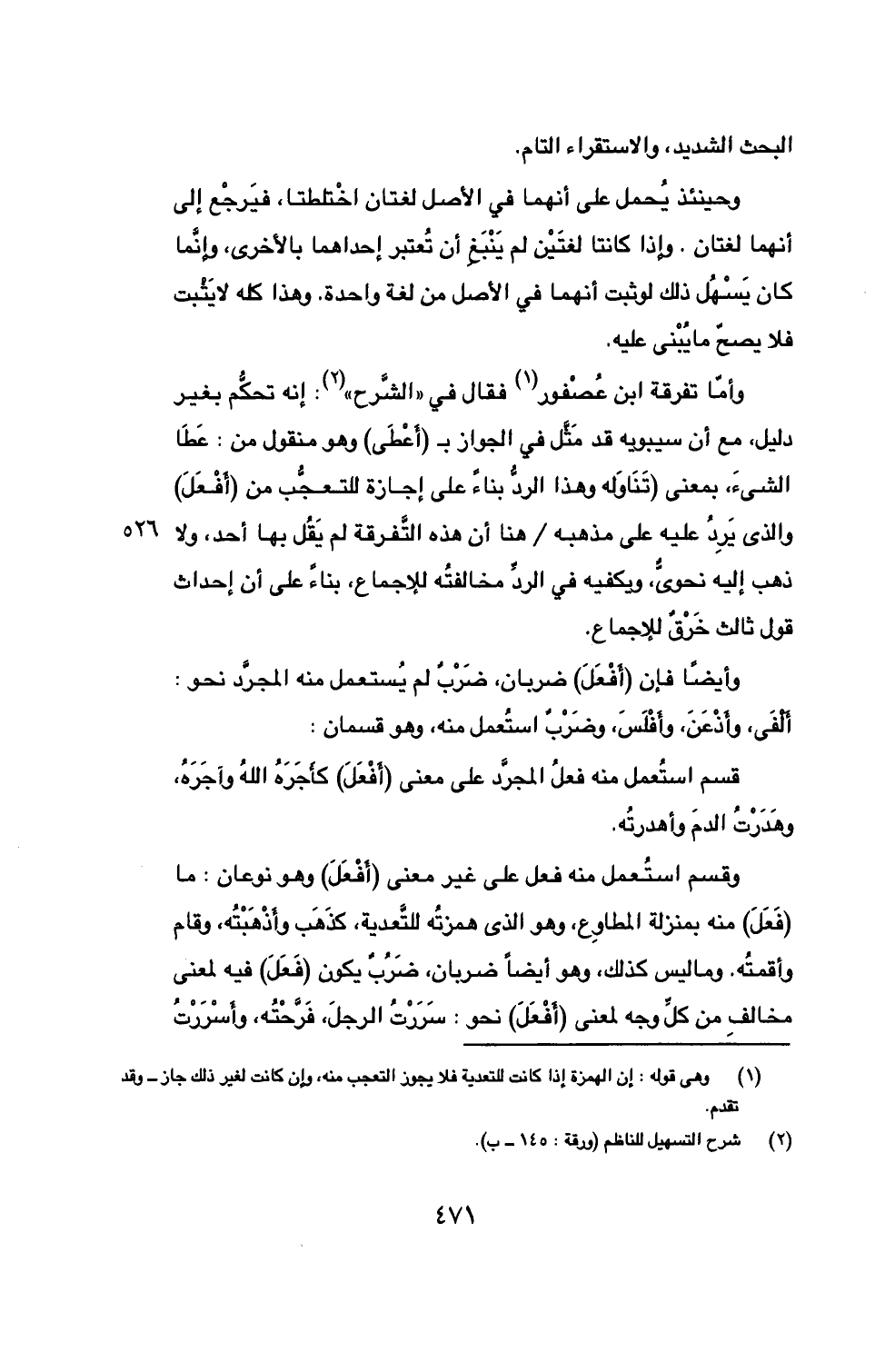 وأمّا تفرقة ابن عُصفور (1) فقال في ((الشَّرح)) (2): إنه تحكُّم بغير دليل، مع أن سيبويه قد مَثَّل في الجواز بـ (أَعْطَى) وهو منقول عن: عَطَا الشيءَ، بمعنى (تَنَاوَله وهذا الردُّ بناءً على إجازة للتعجُّب من (أَفْعَلَ) والذي يَرِدُ عليه على مذهبه/ هنا أن هذه التفرقة لم يَقُل بها أحد، ولا ذهب ... 526 إليه نحويٌّ، ويكفيه في الردِّ مخالفتُه للإجماع، بناءً على أن إحداث قول ثالث خَرْقٌ للإجماع.