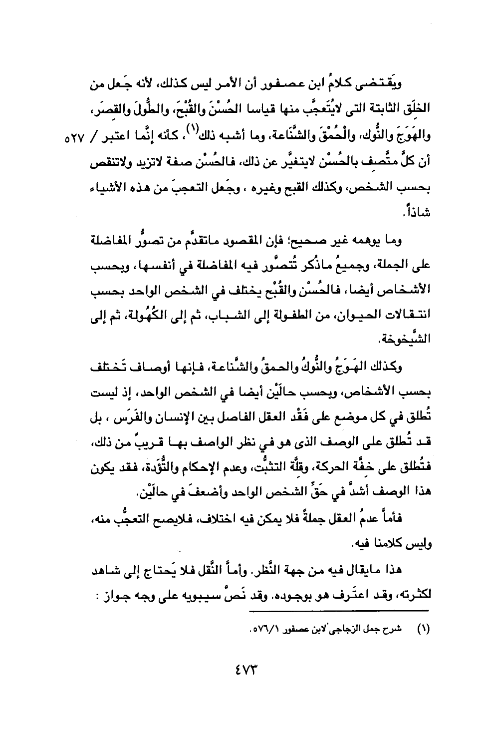ويَقتضي كلامُ ابن عصفور أن الأمر ليس كذلك، لأنه جَعل من الخِلَق الثابتة التي لا يُتَعجَّب منها قياسا الحُسْنَ والقُبْحَ، والطُّولَ والقِصَر، والهَوَجَ والنُّوك، والْحُمْقَ والشَّنَاعة، وما أشبه ذلك (1)، كأنه إنَّما اعتبر/ أن كلَّ متَّصِف بالحُسْن لا يتغيَّر عن ذلك، فالحُسْن صفة لا تزيد ولا ... 527 تنقص بحسب الشخص، وكذلك القبح وغيره، وجَعل التعجبَ من هذه الأشياء شاذاً.