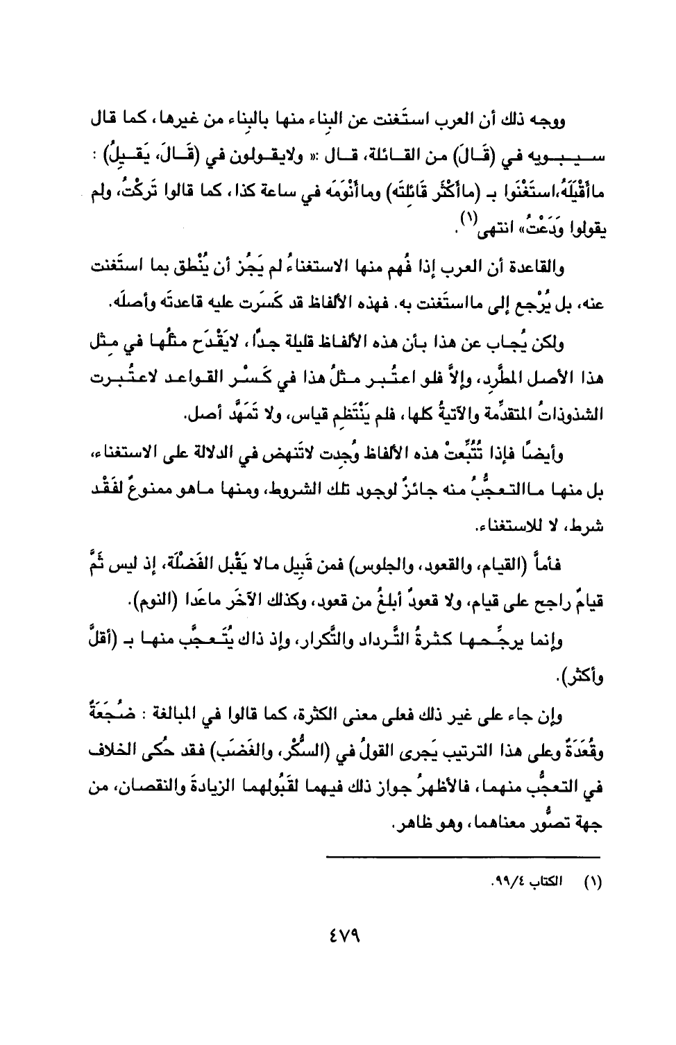 والقاعدة أن العرب إذا فُهم منها الاستغناءُ لم يَجُز أن يُنْطق بما استَغنت عنه، بل يُرْجع إلى ما استَغنت به. فهذه الألفاظ قد كَسَرت عليه قاعدتَه وأصلَه.