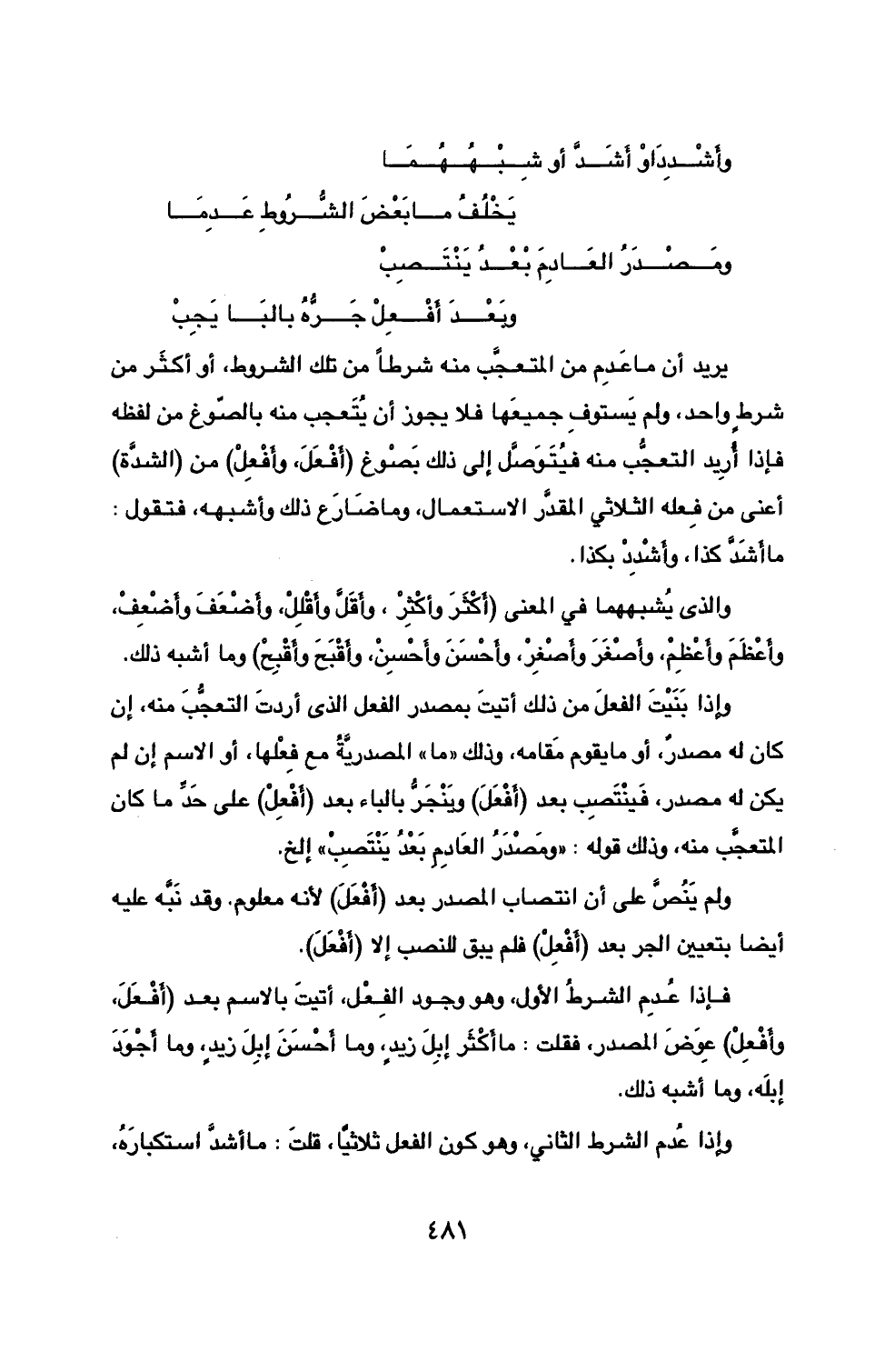 يرد أن ما عَدِم من المتعجَّب منه شرطاً من تلك الشروط، أو أكثر من شرطٍ واحد، ولم يَستوفِ جميعَها فلا يجوز أن يُتَعجب منه بالصّوغ من لفظه فإذا أُريد التعجُّب منه فيُتَوَصَّل إلى ذلك بَصْوغ (أَفْعَلَ، وأَفْعِلْ) من (الشدَّة) أعني من فِعله الثلاثي المقدَّر الاستعمال، وما ضَارَع ذلك وأشبهه، فتقول: ما أَشَدَ كذا، وأَشْدِدْ بكذا.