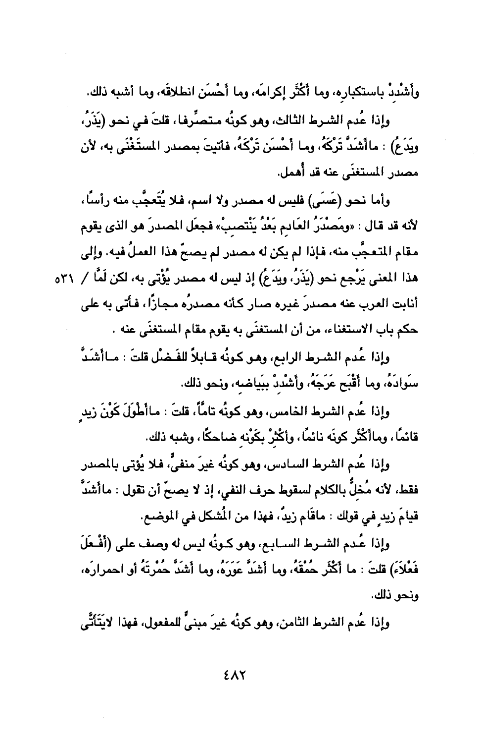 وإذا عُدم الشرط السادس، وهو كونُه غيرَ منفيٍّ، فلا يُؤتى بالمصدر فقط، لأنه مُخِلٌّ بالكلام لسقوط حرف انفي، إذ لا يصحّ أن تقول: ما أَشَدَّ قيامَ زيدٍ في قولك: ما قَام زيدٌ، فهذا من المُشكل في الموضع.