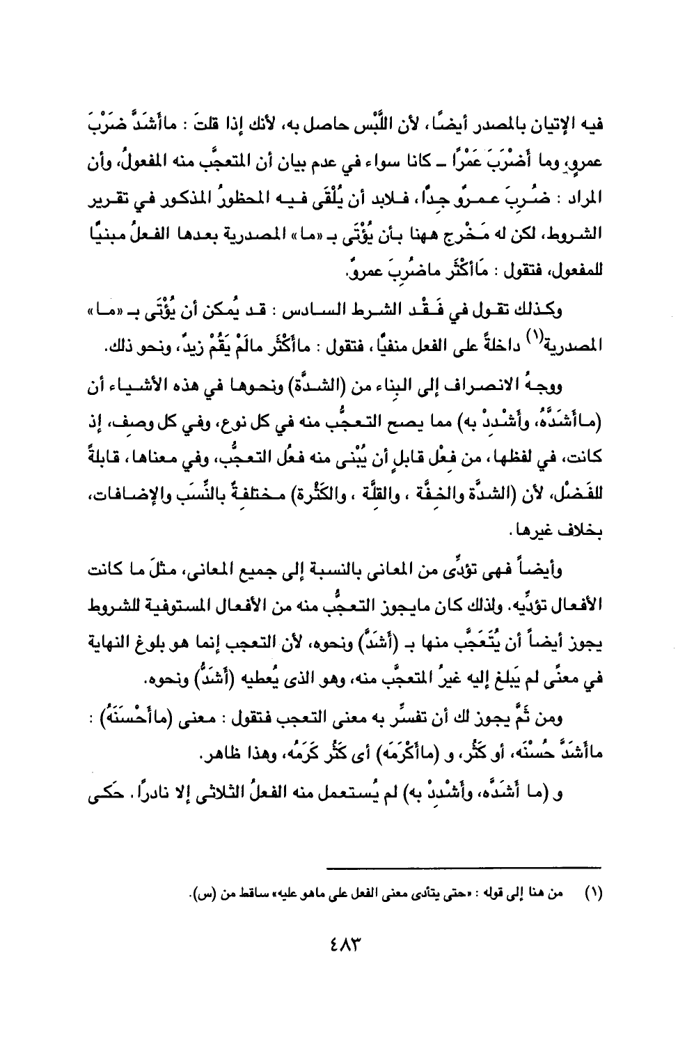 وكذلك تقول في فَقْد الشرط السادس: قد يُمكن أن يُؤْتَى بـ ((ما)) المصدرية (1) داخلةً على الفعل منفياً، فتقول: ما أَكْثَر مالَمْ يَقُمْ زيداً، ونحو ذلك.