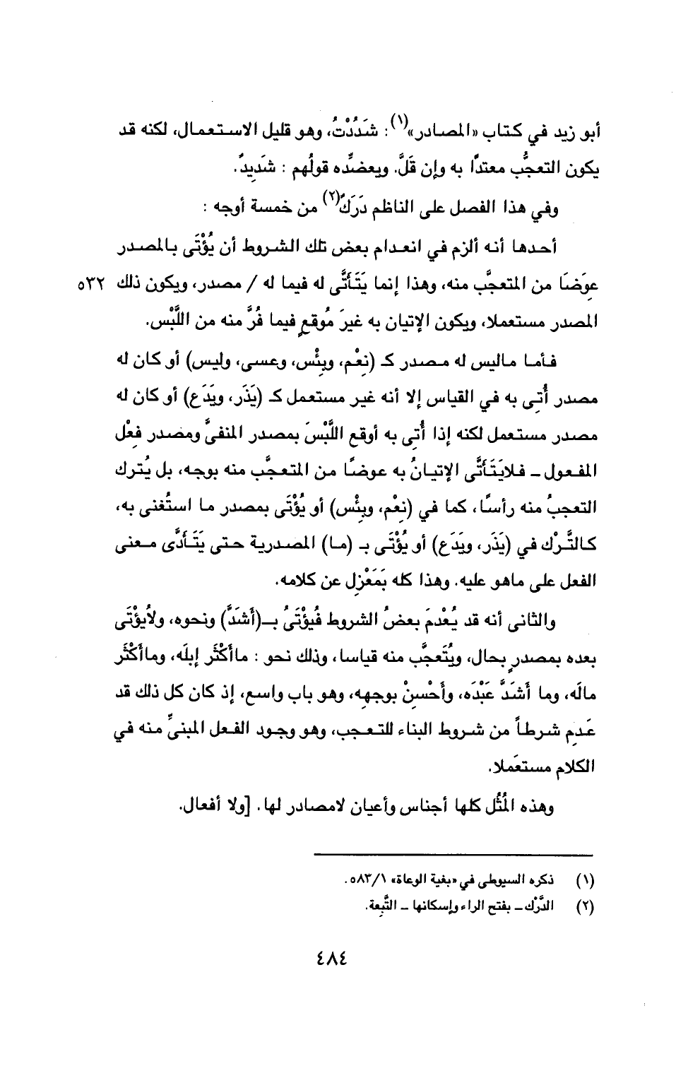 أحدهما أنه ألزم في انعدام بعض تلك الشروط أن يُؤْتَى بالمصدر عِوَضَا من المتعجَّب منه، وهذا إنما يَتَأَتَّى له فيما له/ مصدر، ويكون ذلك المصدر مستعملا، ويكون الإتيان به ... 532 غيرَ مُوقعٍ فيما فُرَّ منه من اللَّبْس.