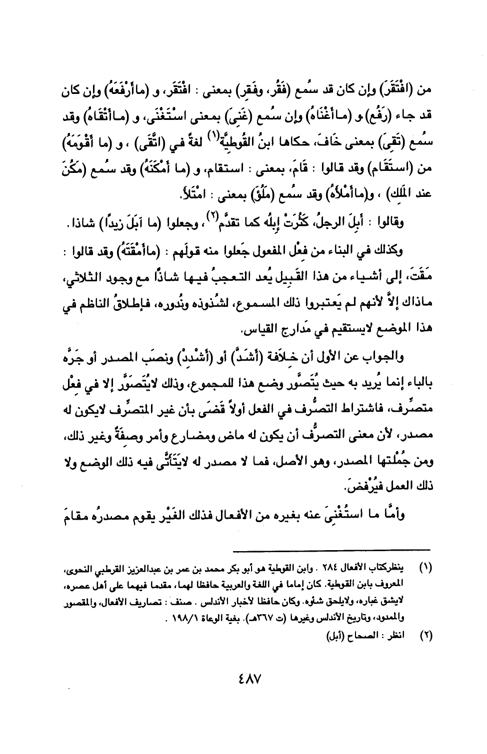 (1) ينظر كتاب الأفعال 284. وابن القوطية هو أبو بكر محمد بن عمر بن عبد العزيز القرطبي النحوي، المعروف بابن القوطية. كان إماما في اللغة العربية حافظا لهما، مقدما فيهما على أهل عصره، لا يشق غباره، ولا يلحق شأوه. وكان حافظا لأخبار الأندلس. صنف: تصاريف الأفعال، والمقصور والممدود وتاريخ الأندلس وغيرها (ت 367 هـ). بغية الوعاة 1/ 198.