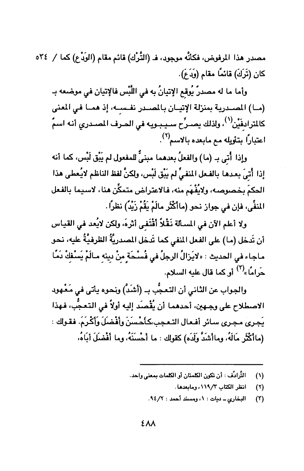 ولا أعلم الآن في المسألة نَقْلاً اَقْتَفِى اثرهَ، ولكن لا يُعد في القياس أن تَدخل (ما) على الفعل المنفي كما تَدخل المصدريَّةُ الظرفيَّةُ عليه، نحو ما جاء في الحديث: ((لا يَزالُ الرجلُ في فُسْحَة مِنْ دِيتهِ مالَمْ يَسْفِكْ دَماً حَراماً)) (3) أو كما قال عليه السلام.