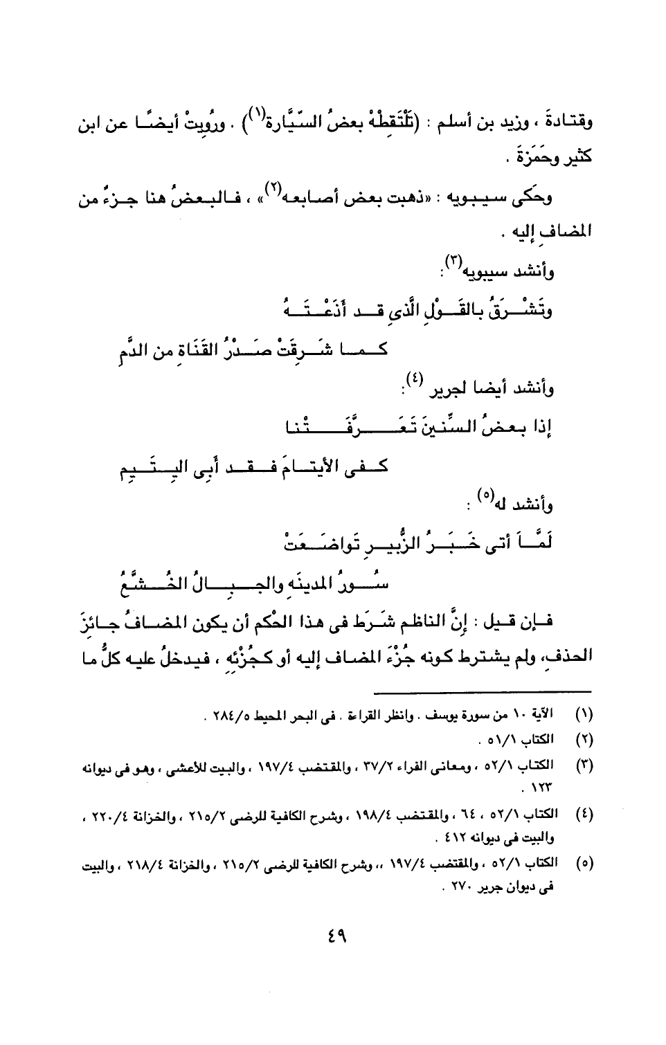 (5) الكتاب 1/ 52، والمقتضب 4/ 197، وشرح الكافية للرضي 2/ 215، والبيت في ديوان جرير 270.