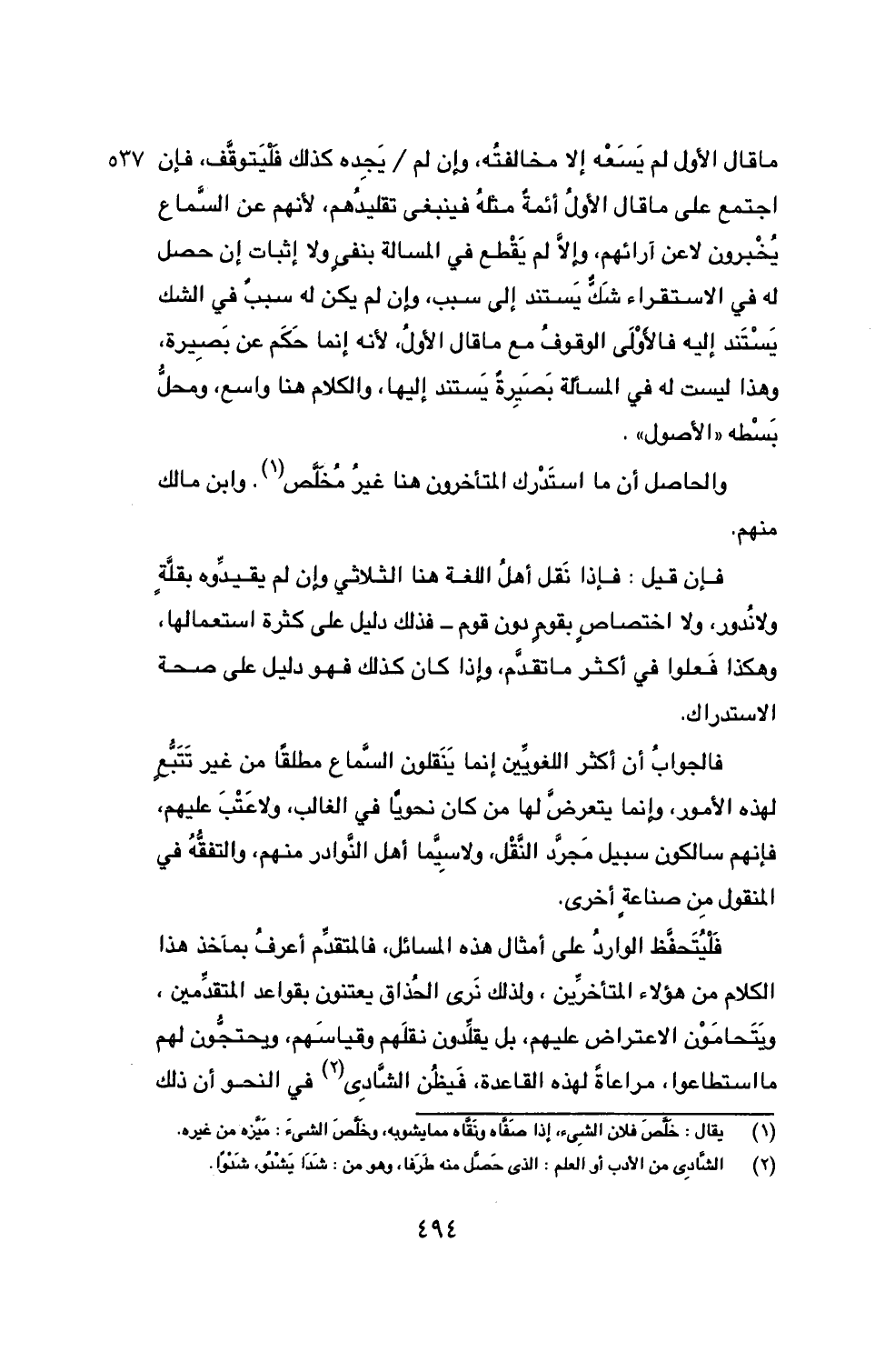 فَلْيُتَحفَّظ الواردُ على أمثال هذه المسائل، فالمتقدم أعرفُ بمآخذ هذا الكلام من هؤلاء المتأخرِّين، ولذلك نَرى الحُذاق يعتنون بقواعد المتقدِّمين، ويَتَحامَوْن الاعتراض عليهم، بل يقلِّدون نقلَهم وقياسَهم، ويحتجُّون لهم ما استطاعوا، مراعاةً لهذه القاعدة، فَيظُن الشَّادِي (2) في النحو أن ذلك