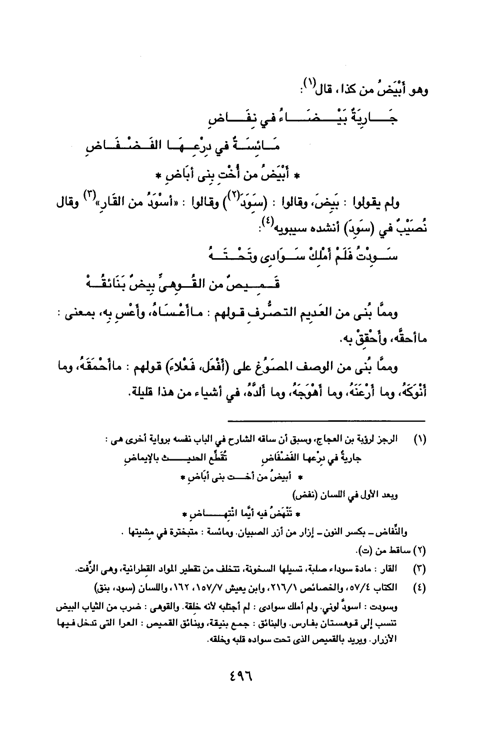 ولم يقولوا: بَيِضَ، وقالوا: (سَوِدَ (2)) وقالوا: ((أسْوَدُ من القَارِ)) (3) وقال نُصَيْبٌ في (سَوِدَ) أنشده سيبويه (4):