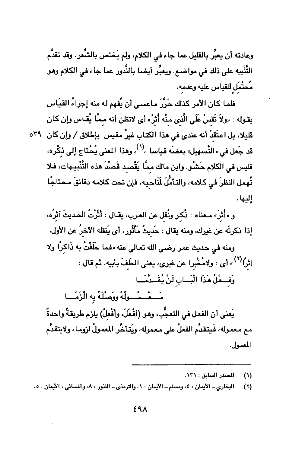 فلما كان الأمر كذلك حَرَّرَ ما عسى أن يُفهم له منه إجراءُ القيَاس بقوله: ((ولاَ تَقِسْ عَلَى الَّذِي مِنْه أُثِرْ)) اي لا تظن أنه مِمَّا يُقاس وإن كان قليلا، بل اعتَقِدْ أنه عندي في هذا الكتاب غيرُ مقيس بإطلاق/ وإن كان قد جَعل في ((التَّسهيل)) بعضَه قياسا (1)، وهذا المعنى يُحْتاج إلى ... 539 ذِكْره، فليس في الكلام حَشْو. وابن مالك ممَّا يَقْصد قَصْدَ هذه التَّنْبيهات، فلا تُهمل النظرَ في كلامه، والتأمُّلَ لمَنَاحِيه، فإن تحت كلامه دقائقَ محتاجاً إليها.