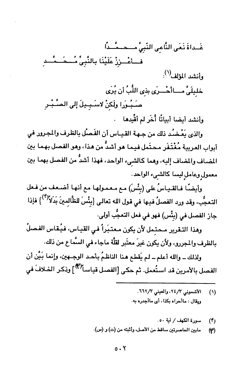 وأيضاً فالقياسُ على (بِئْسَ) مع معمولها مع أنها أضعف من فعل التعجُّب، وقد ورد الفصلُ فيها في قول الله تعالى {بِئْسَ للظَّالِمينَ بَدَلاً (2)} فإذا جاز الفصل في (بِئْس) فهو في فعل التعجُّب أولى.