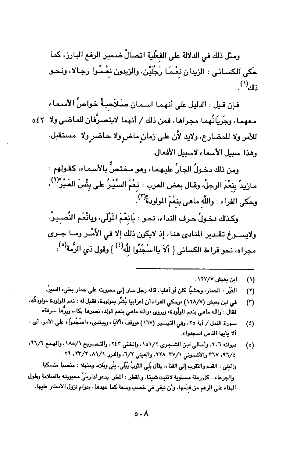 وكذلك دخولُ حرف النداء، نحو: يَا نِعْمَ المَوْلَى، ويا نعْمَ النَّصِيرُ. ولا يسوغ تقدير المنادى هنا، إذ لا يكون ذلك إلا في الأَمْر وما جرى مجراه، نحو قراءة الكسائي {أَلاَ يا اسْجُدُوا لِلَّه (4)} وقول ذي الرُّمة (5):