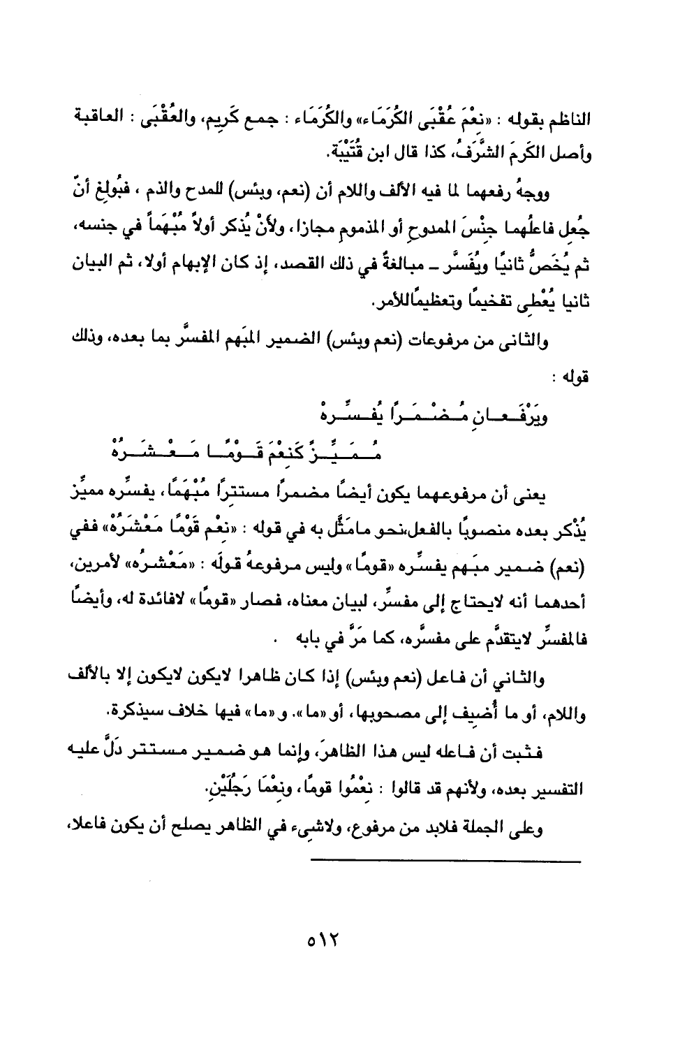 يعني أن مرفوعهما يكون أيضاً مضمراً مستتِراً مُبْهَماً، يفسِّره مميِّز يُذْكر بعده منصوباً بالفعل، نحو ما مَثَّل به في قوله: ((نِعْم قَوْماً مَعْشَرُهْ)) ففي (نعم) ضمير مبهم يفسِّره ((قوماً)) وليس مرفوعهُ قولَه: ((مَعْشرُه)) لأمرين، أحدهما أنه لا يحتاج إلى مفسِّر، لبيان معناه، فصار ((قوماً)) لا فائدة له، وأيضاً فالمفسِّر لا يتقدَّم على مفسَّره، كما مَرَّ في بابه.