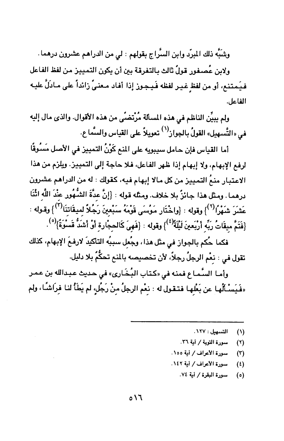أما القياس فإن حامل سيبويه على المنع كَوْنُ التمييز في الأصل مَسُوقاً لرفع الإبهام، ولا إبهام إذا ظهر الفاعل، فلا حاجة إلى التمييز. ويلزم من هذا الاعتبار منعُ التمييز من كل ما لا إبهام فيه، كقولك: له من الدراهم عشرون درهما. ومثل هذا جائزٌ بلا خلاف. ومثله قوله: {إنَّ عِدَّةَ الشُّهُور عِنْدَ اللهِ اثْنَا عَشَرَ شَهْراً (2)} وقوله: {واخْتَار مَوُسَى قَوْمَهُ سَبْعِينَ رَجُلاً لِميقَاتِنَا (3)} وقوله: {فَتَمَّ مِيقَاتُ رَبِّهِ أَرْبَعينَ لَيْلَةً (4)} وقوله: {فَهِيَ كَالحِجْارةِ أَوْ أَشَدُّ قَسْوَةً} (5).