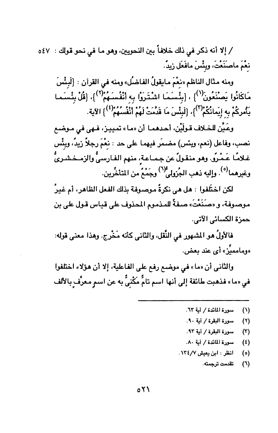 ومنه مثال الناظم ((نِعْمَ ما يقولُ الفاضلُ)) ومنه في القرآن: {لَبِئْسَ مَا كَانُوا يَصْنَعُونَ (1)}، {بِئْسَمَا اشْتَرَوْا بِهِ أَنْفُسَهُمْ (2)}، {قُلْ بِئْسَما يَأَمركُمْ بِهِ إِيَمانُكُمْ (3)}، {لَبِئْسَ مَا قَدَّمَتْ لَهُمْ أَنْفُسُهُمْ (4)} الآية.