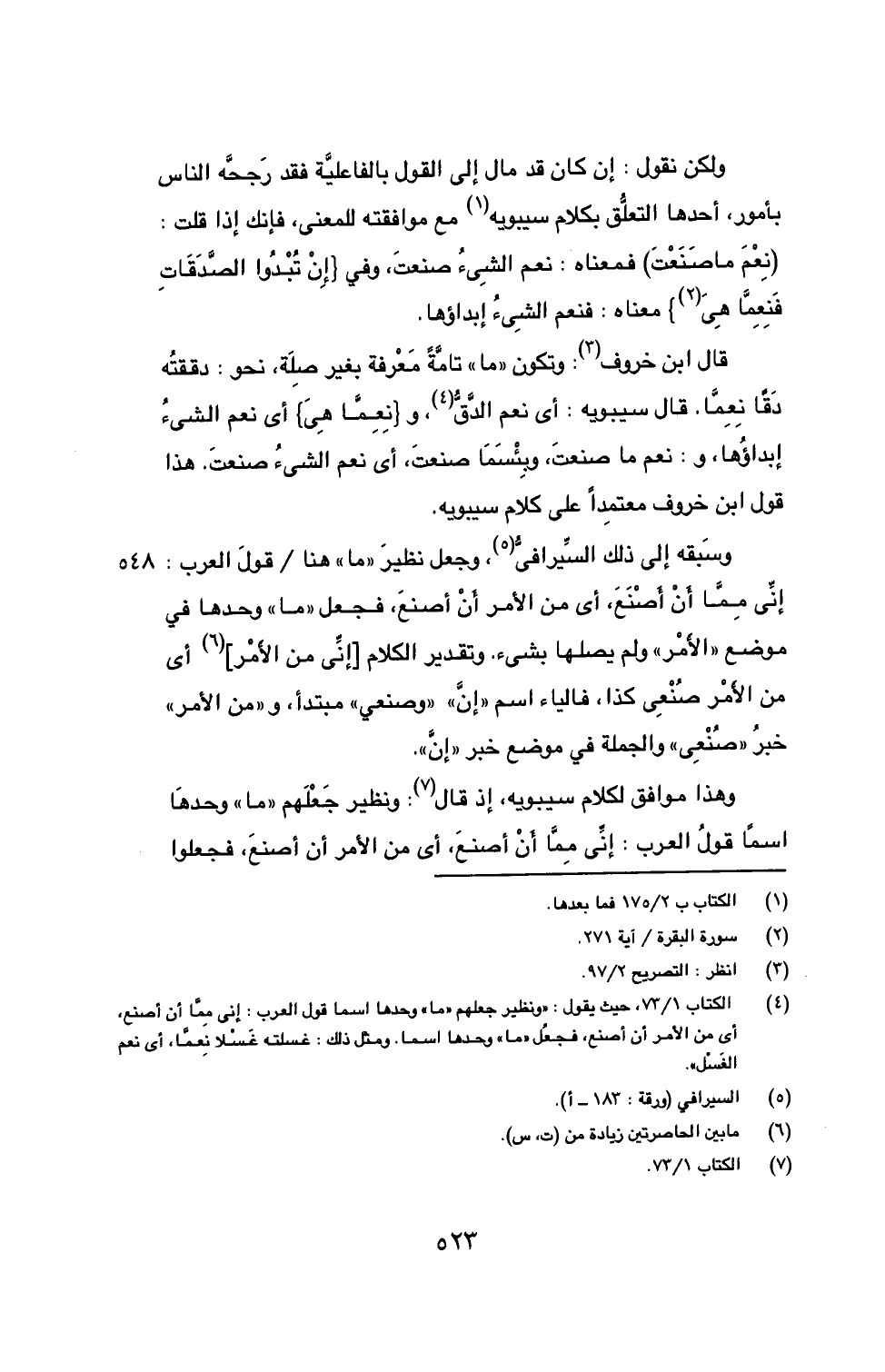 (4) الكتاب 1/ 73، حيث يقول: ((ونظير جعلهم ((ما)) وحدها اسما قول العرب: إني مِمَّا أن أصنع، أي من الأمر أن أصنع، فجعُل ((ما)) وحدها اسما. مثل ذلك: غسلته غَسْلا نِعمَّا، أي نعم الغَسْل)).