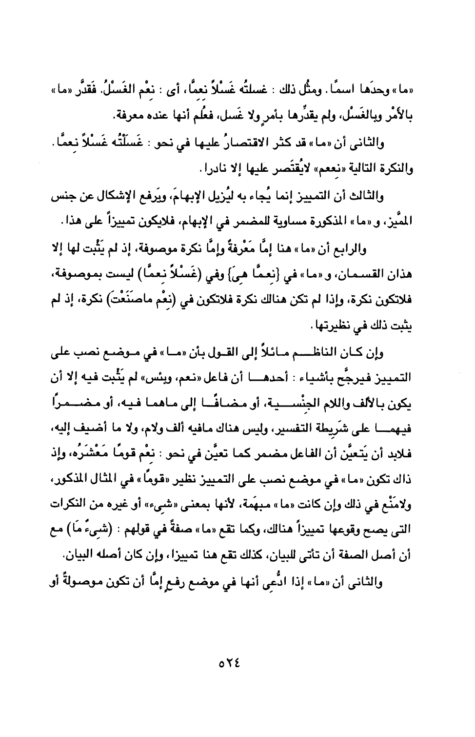 والثاني أن ((ما)) قد كثر الاقتصارُ عليها في نحو: غَسَلْتُه غَسْلاً نِعمَّا. والنكرة التالية ((نِعم)) لا يُقتَصر عليها إلا نادرا.