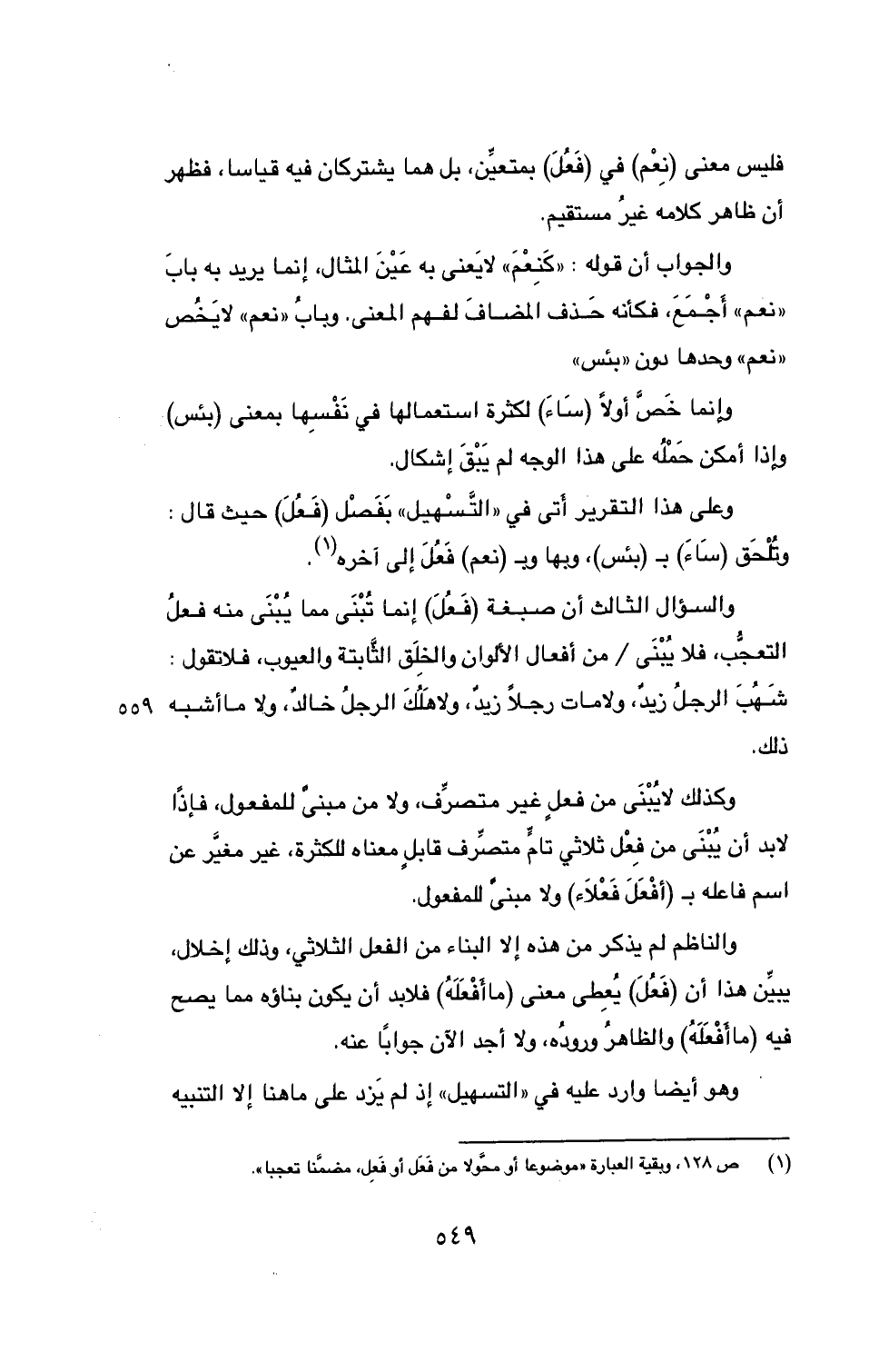(1) ص 128، وبقية العبارة ((موضوعا أو محَّولا من فَعَل أو فَعِل، مضمَّنا تعجبا)).