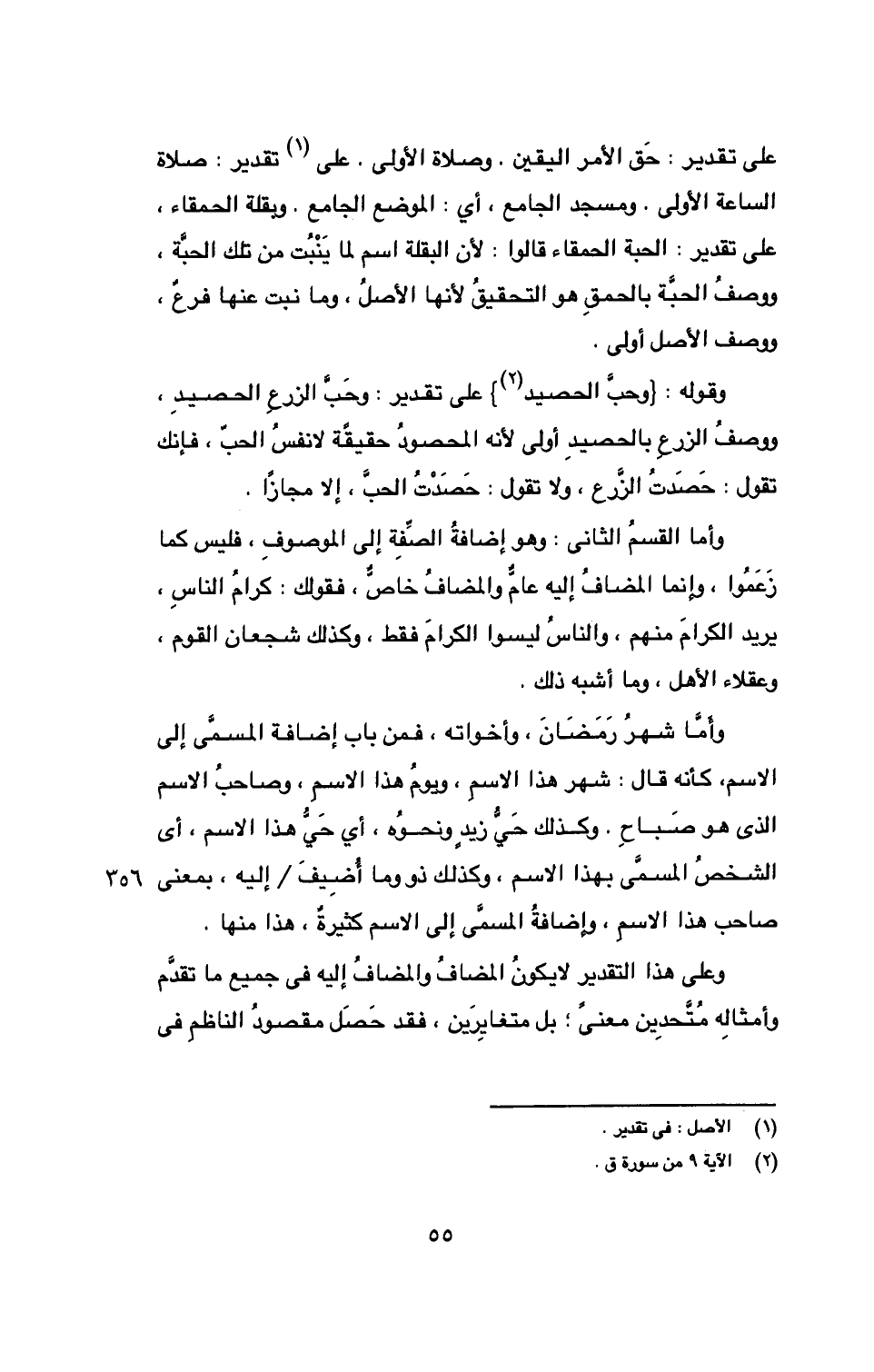وقوله: {وحبَّ الحصيد (2)} على تقدير: وحَبَّ الزرعِ الحصيدِ، ووصفُ الزرعِ بالحصيدِ أولى لأنه المحصودُ حقيقة لا نفس الحب، فإنك تقول: حَصَدتُ الزَّرع، ولا تقول: حَصَدْتُ الحبَّ، إلا مجازا.